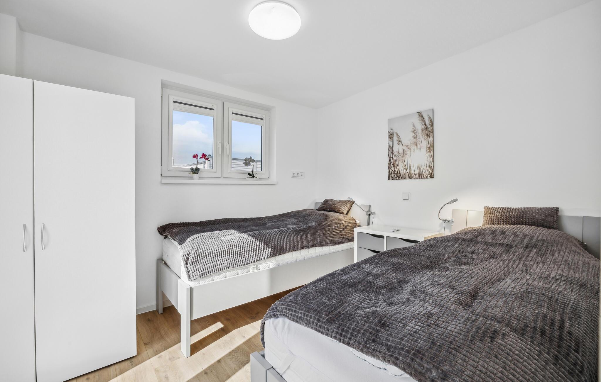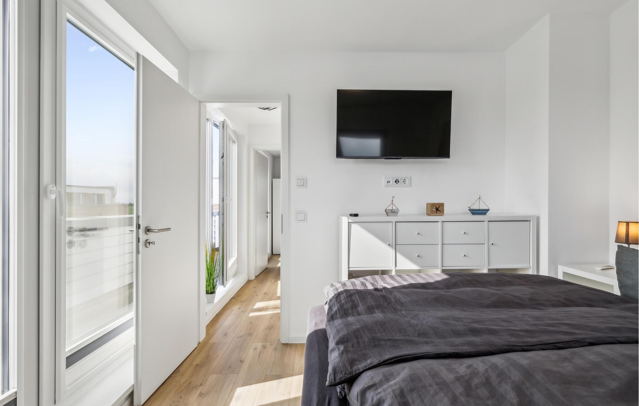 Fra stueetagen kan I komme op til dobbelthusets øverste etage via en buet trappe, hvor to rummelige soveværelser venter. Her kan I nyde den skønne vesterhavsluft fra en omgivende altan, som er tilgængelig fra begge soveværelser. Møbler af høj kvalitet og en vellykket rumindretning gør dette til en vaskeægte drømmebolig til en skøn ferie med familien.