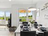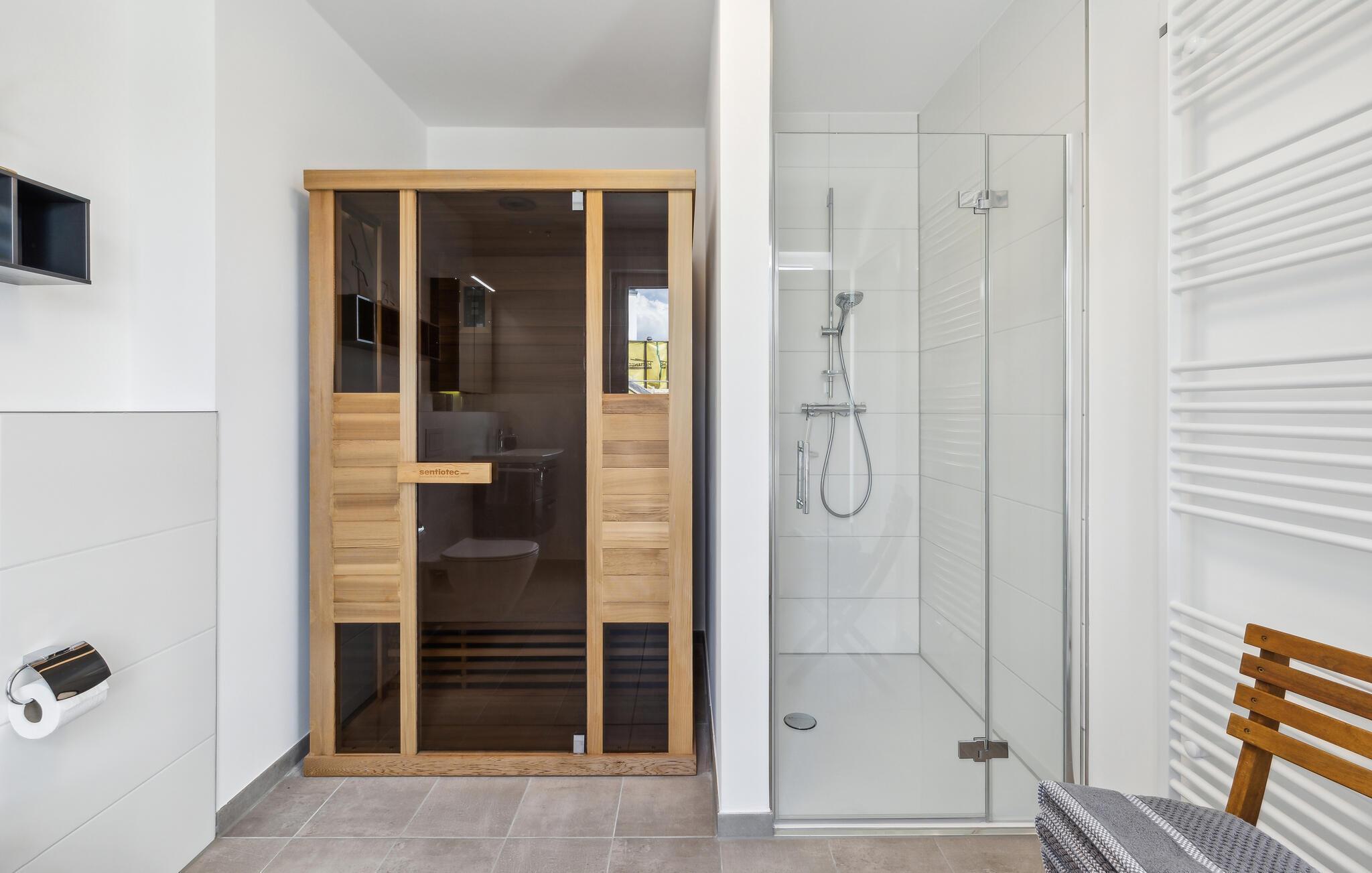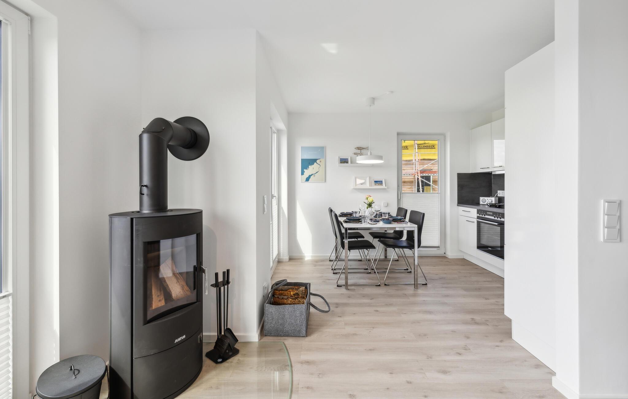 Huset fordeler sig over to etager. I stueetagen er der en åben, hyggelig opholdsstue med en tilstødende haveterrasse og et moderne udstyret køkken, som lægger op til hyggestunder, hvor I kan nyde udsigten gennem de store gulv til loft-vinduer. På kolde dage kan I finde jer godt tilpas foran den indbyggede brændeovn. Et brusebadeværelse og et soveværelse ligger langs gangen på begge sider, og en trappe bag badeværelset fører til øverste etage. Der er soveværelse og badeværelse med brusekabine og infrarød sauna, som lægger op til afslapning. Her kan I nyde den skønne havsluft fra en altan, som er tilgængelig fra begge værelser. De lækre indretningsløsninger og en vellykket rumdeling gør denne bolig til et sandt drømmehus.