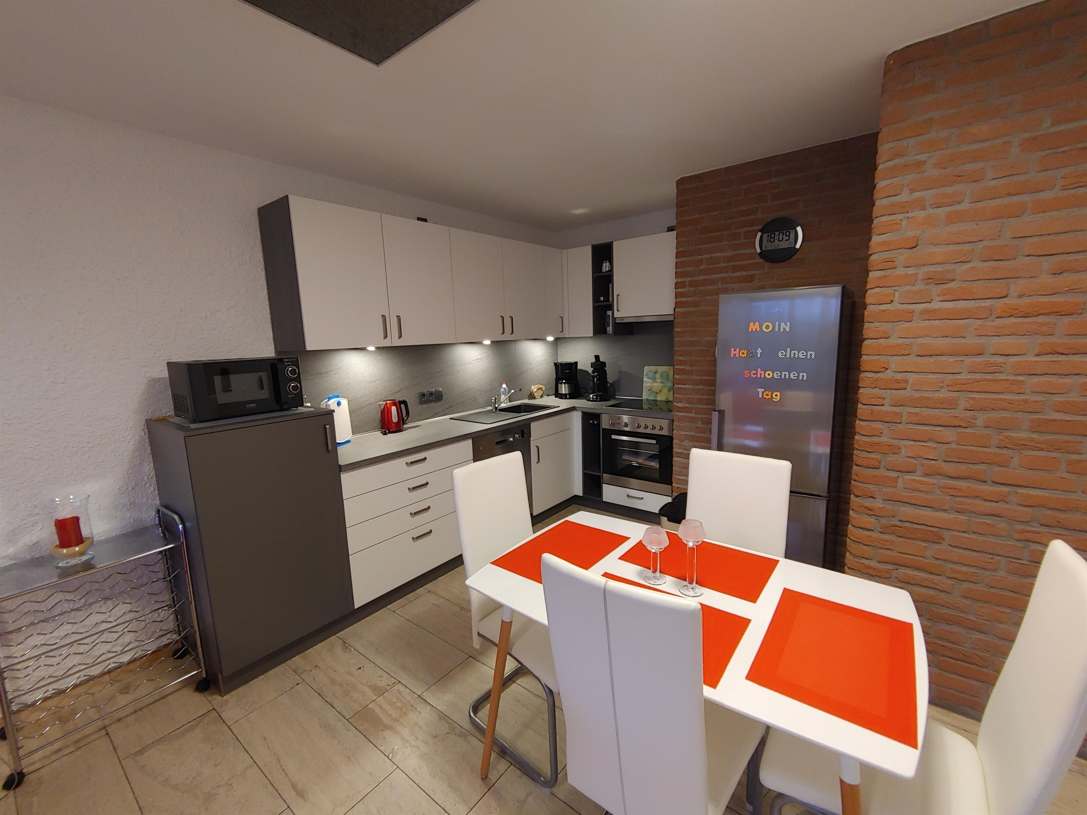 In dem großzügigen Wohnzimmer mit der roten gemütlichen Sitzgruppe und Tisch befinden sich auch 2 Schrankbetten mit den Maßen 2m x 0,9m. Ein Flachbildschirm sowie ein Radio sind ebenfalls vorhanden. Einbezogen ist hier auch eine große, moderne Küche mit einem Esstisch und 4 Stühlen um gemütlich gemeinsamen zu Essen oder Spiele zu spielen. Von hier aus gelangen Sie durch die große Fensterfront auf Ihren Südbalkon. In dem hellen Schlafzimmer ist ein Doppelbett 1,80m x 2 m. Die beiden Nachttische mit Nachttischlampen und einem geräumigen Einbauschrank bieten mit genügender Anzahl von Kleiderbügeln und Borten reichlich Platz für Ihre Garderobe. Alle Räume werden mit einer modernen Infrarot-Deckenheizung beheizt. Das Kinderbabybett und der Kinderhochstuhl können kostenpflichtig dazu gebucht werden. Die Energie- und Endreinigungskosten sind inklusive!! Ein Hund kann mitgebracht werden, gegen Gebühr, eine Kaution in 50 Euro wird zusätzlich erhoben