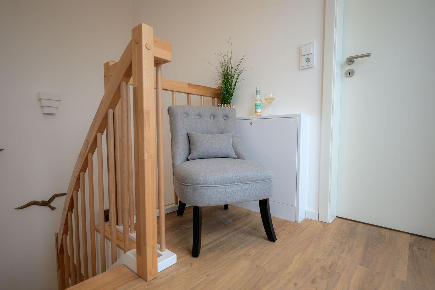 Im Obergeschoss befinden sich zwei liebevoll eingerichtete Schlafzimmer – eines mit komfortablem Boxspringbett, das andere mit zwei Einzel-Boxspringbetten. Beide Zimmer sind mit Smart-TV, Verdunkelung und viel Stauraum ausgestattet – ideal für Paare, Familien oder Freunde.