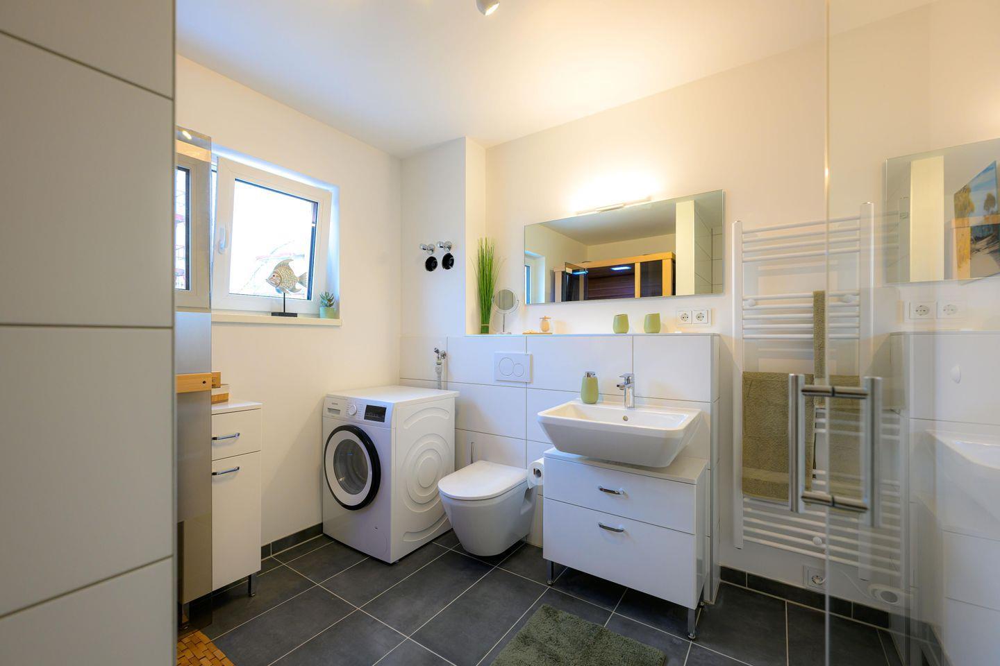 Nach einem Tag an der Nordseeluft wartet dein privater Wellnessbereich: Das großzügige Badezimmer bietet eine moderne, bodengleiche Dusche und eine Infrarotsauna – perfekt zum Abschalten und Regenerieren.