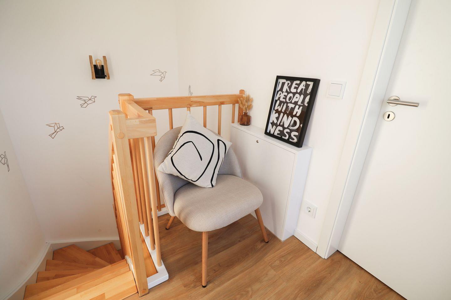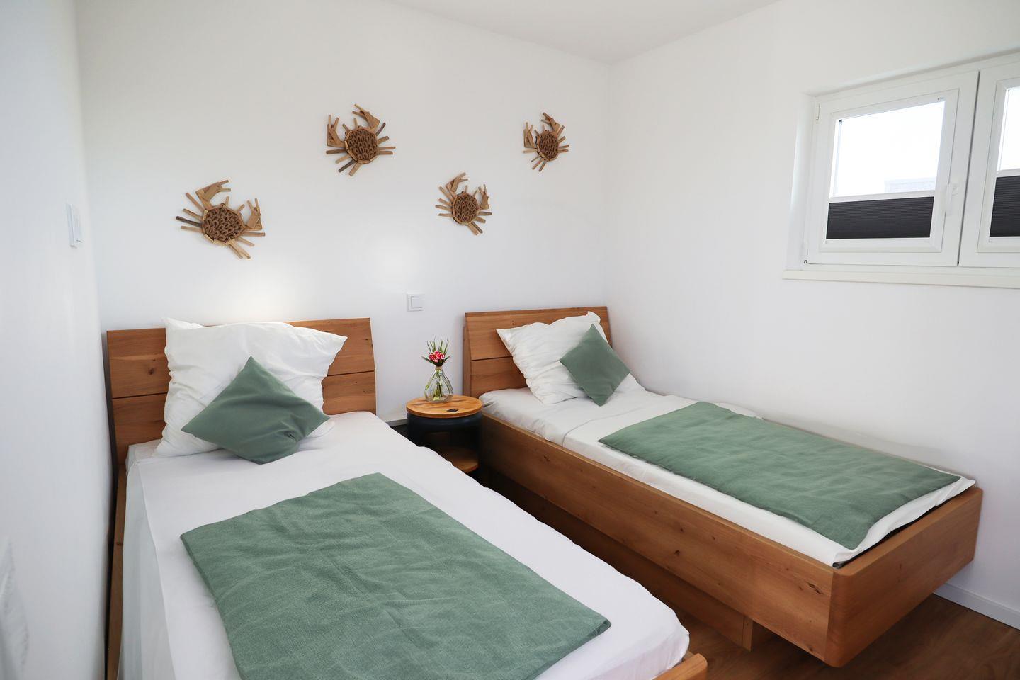 Im Obergeschoss befinden sich zwei liebevoll eingerichtete Schlafzimmer mit Zugang zum Balkon. Das erste Schlafzimmer verfügt über ein komfortables Doppelbett (180?x?200?cm), das zweite über zwei Einzelbetten (je 100?x?200?cm) – ideal für Freunde oder Kinder. Beide Zimmer sind mit Verdunkelungsplissees ausgestattet und bieten dir einen erholsamen Schlaf.