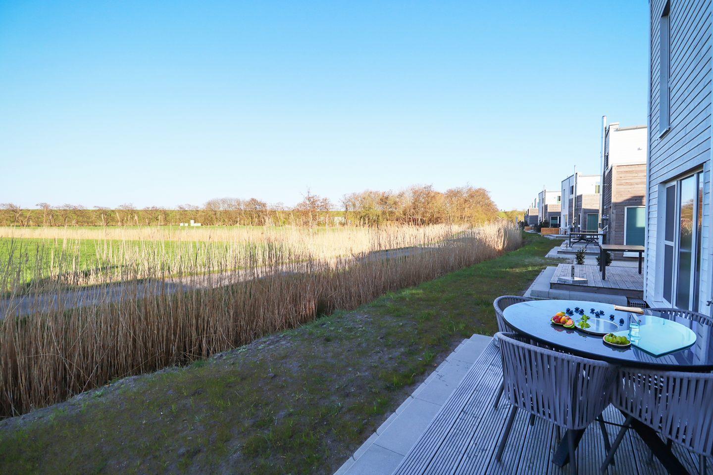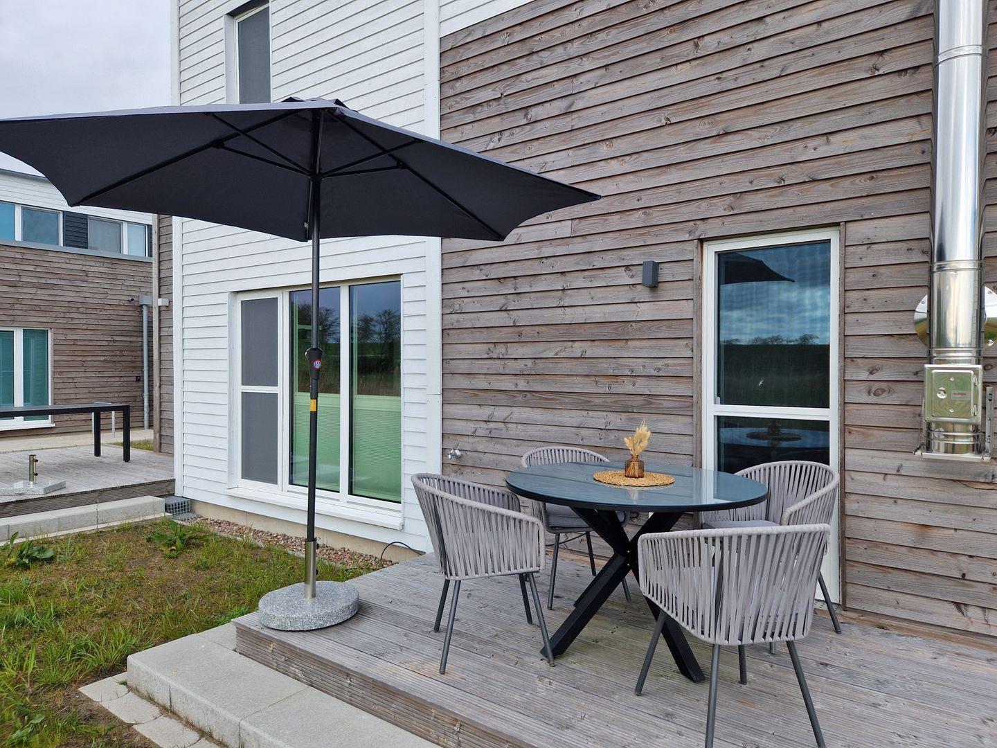 Im hellen Wohnbereich mit bodentiefen Fenstern lässt es sich wunderbar entspannen. Der Kamin sorgt für behagliche Stimmung – perfekt nach einem windigen Tag am Strand. Die offene Küche ist komplett ausgestattet und lädt zum gemeinsamen Kochen ein. Von hier aus gelangst du direkt auf die Terrasse mit Gartenmöbeln und Sonnenplatz.