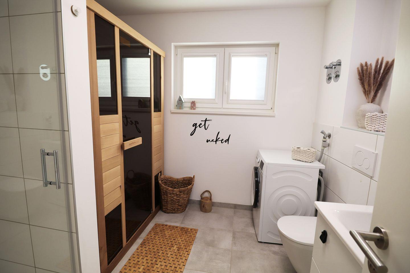 Das moderne Badezimmer verwöhnt dich mit einer großzügigen, bodengleichen Dusche und einer privaten Infrarotsauna – perfekt zum Abschalten. Genieße dein persönliches Wellnessprogramm ganz privat.
