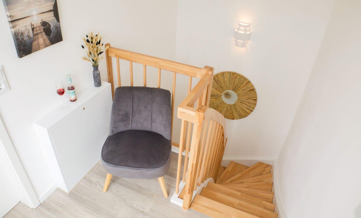 Das Erdgeschoss beherbergt ein Schlafzimmer mit zwei komfortablen Einzel-Boxspringbetten – ideal für Freunde oder Kinder. Im Obergeschoss schläfst du im gemütlichen Doppel-Boxspringbett. Beide Schlafzimmer verfügen über einen Smart-TV, Verdunkelungsplissees und liebevolle Details für ein rundum wohnliches Ambiente.