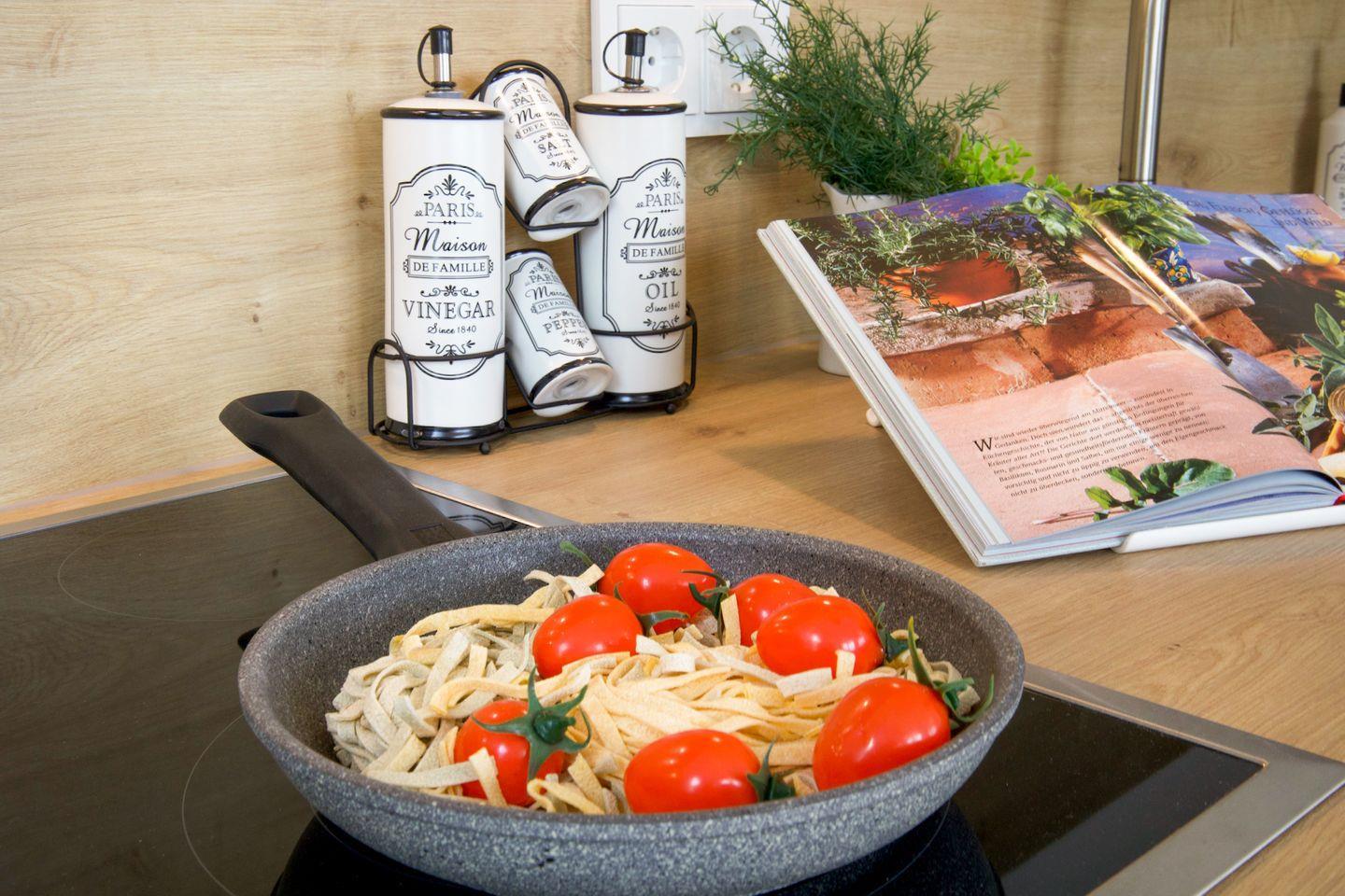 Im offenen Wohnbereich erwartet dich eine stilvolle Sitzecke mit Smart-TV (MagentaTV), ein Holzofenkamin für gemütliche Abende und der direkte Zugang zur Terrasse und zum Garten. Die moderne Küche ist komplett ausgestattet – perfekt für gemeinsame Kochmomente.