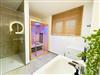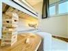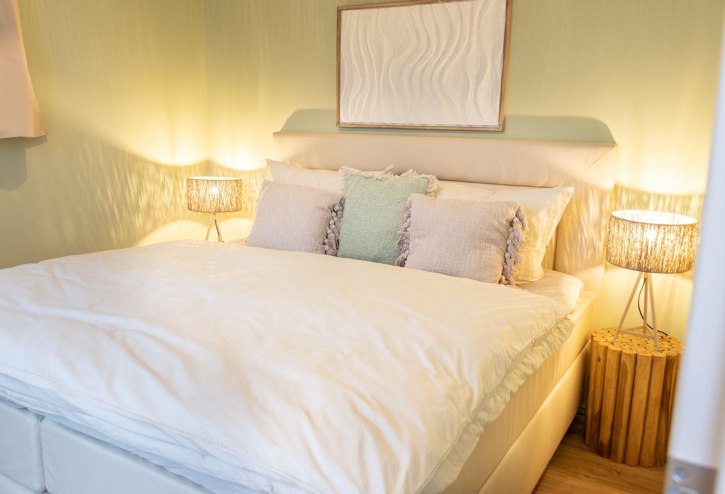 Das Obergeschoss bietet zwei Schlafzimmer: Eines ist mit einem komfortablen Boxspringbett (180x200 cm) ausgestattet und hat direkten Zugang zur Dachterrasse. Im zweiten Schlafzimmer sorgt ein Hochbett mit zusätzlicher Ausziehmatratze für flexible Schlafmöglichkeiten – ideal für Kinder oder Freunde. Vorhänge in beiden Zimmern garantieren erholsamen Schlaf.