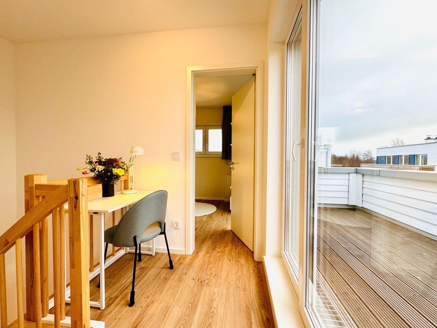 Im offenen Wohnbereich erwarten dich große bodentiefe Fenster, ein bequemer Sitzbereich mit Smart-TV sowie ein Kaminofen für gemütliche Abende. Die moderne, voll ausgestattete Küche mit Spülmaschine, Induktionskochfeld und Backofen lädt zum gemeinsamen Kochen ein. Von hier aus gelangst du direkt auf die Terrasse mit Garten – perfekt für Frühstück im Freien oder laue Sommerabende.