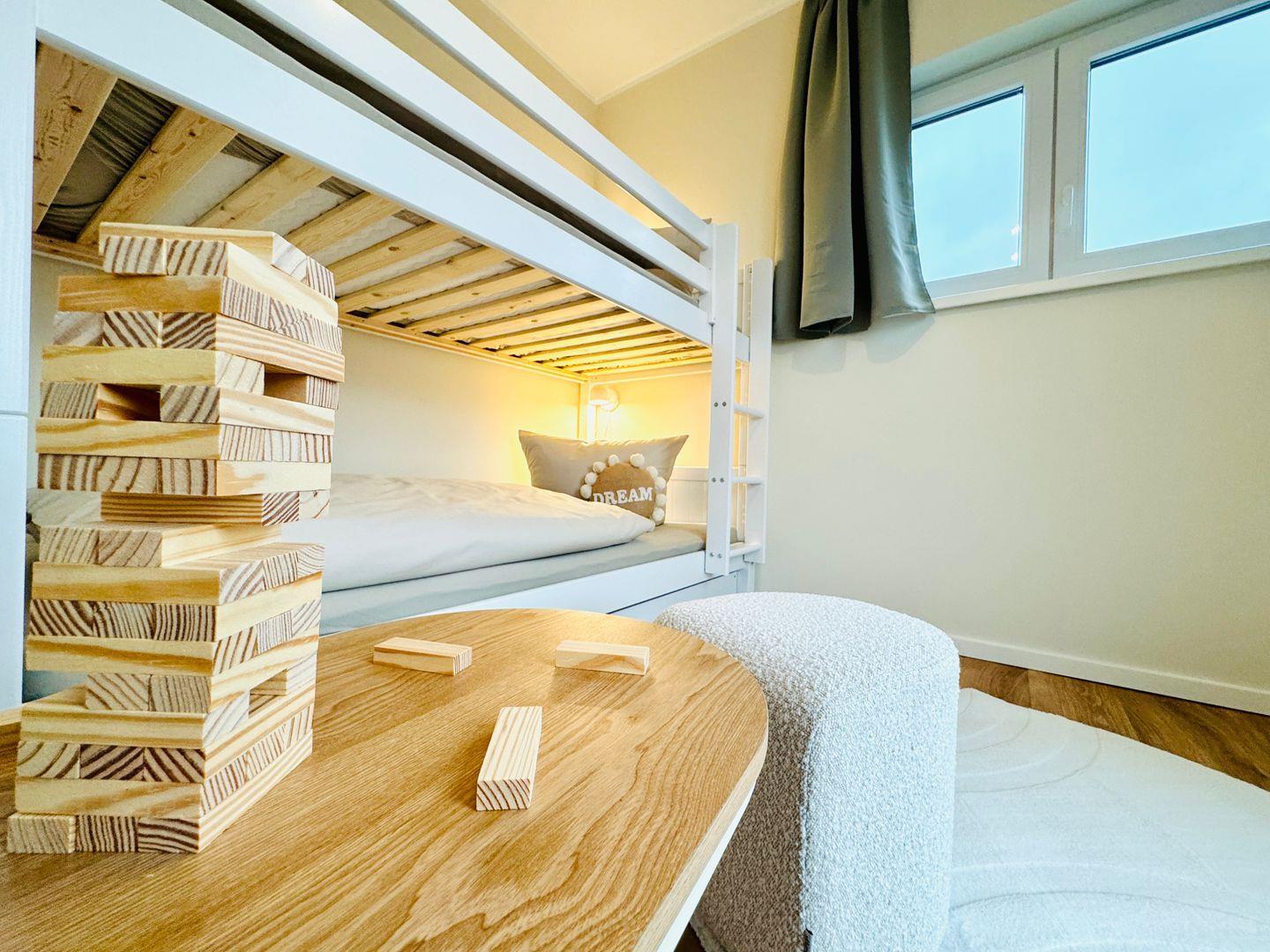 Das zweite Schlafzimmer mit Hochbett, die ruhige Lage und der Garten machen das Haus besonders familienfreundlich. Spiele, Bücher oder ein Kinderstuhl können auf Wunsch ergänzt werden.