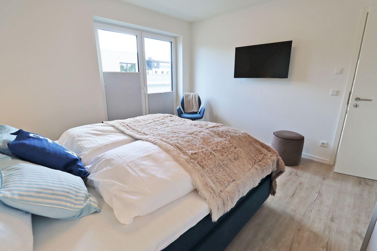 Zwei Schlafzimmer mit hochwertigen Boxspringbetten (180 × 200?cm) und Smart-TV bieten besten Schlafkomfort. Verdunkelungsplissees sorgen für erholsame Nächte. Das Hauptschlafzimmer hat direkten Zugang zur Dachterrasse – für den ersten Sonnenstrahl am Morgen.