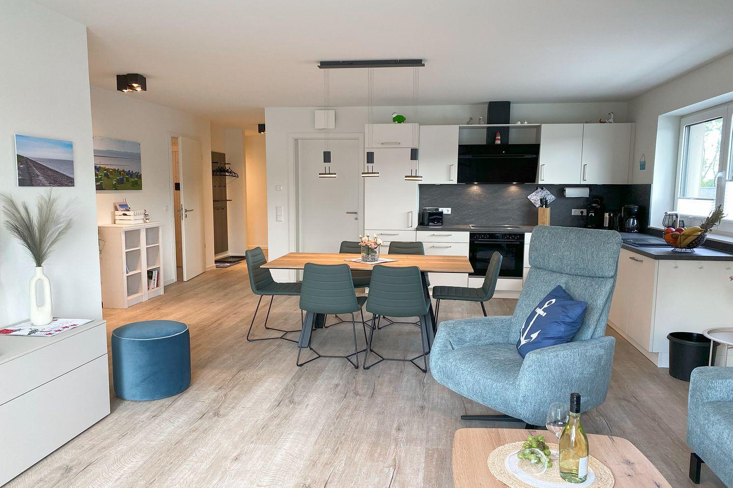 Der helle Wohn- und Essbereich mit Schlafsofa für zwei Gäste bietet reichlich Platz zum Entspannen. Große Fenster, Zugang zur Dachterrasse, Smart-TV und gemütliches Mobiliar schaffen ein modernes und wohnliches Ambiente. Die offene Küche ist mit hochwertigen Geräten, Senseo- und Filterkaffeemaschine ausgestattet – perfekt für gemeinsame Mahlzeiten.