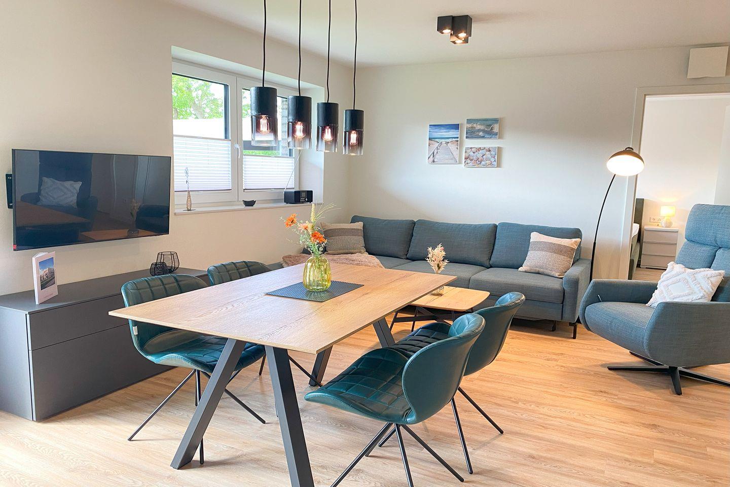 Für kleine Gäste stehen ein Hochstuhl und ein Babybett bereit. Der Wohnbereich bietet genügend Platz zum Spielen – und draußen wartet die frische Nordseeluft.