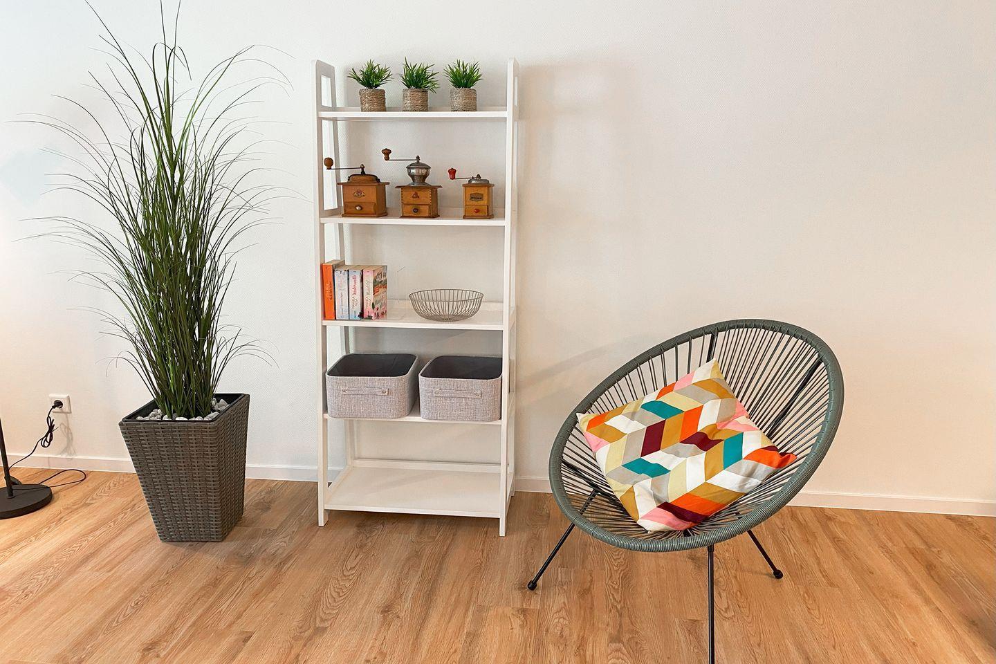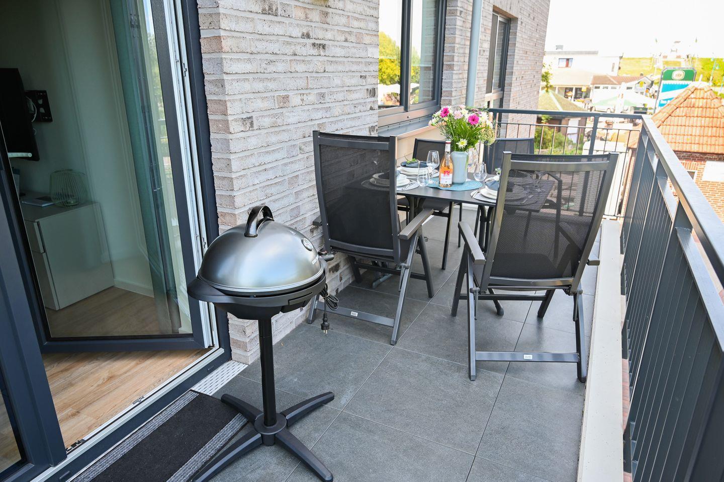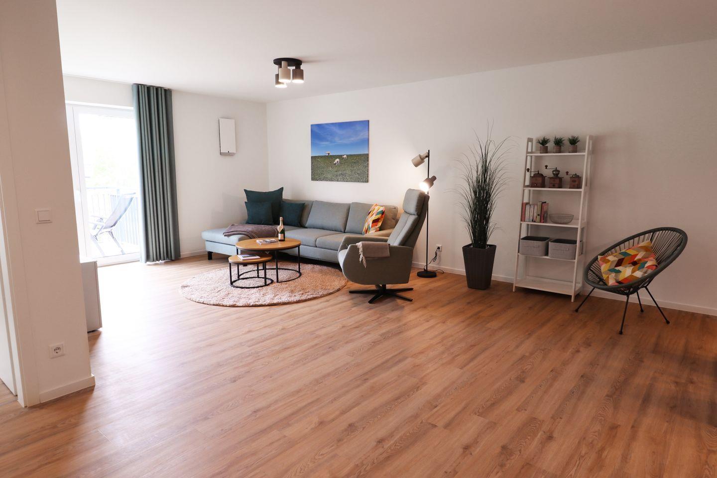 Der großzügige Wohnbereich mit Zugang zum Balkon bietet viel Bewegungsfreiheit und ein herrlich offenes Raumgefühl. Große Fenster lassen viel Licht herein – ideal zum Entspannen, Lesen oder Fernsehen. Die offene Küche ist mit hochwertigen Geräten ausgestattet; Raclette- und Elektrogrill sorgen für kulinarische Vielfalt, auch bei norddeutschem Wetter. Am Esstisch mit Platz für alle lässt sich gemeinsam genießen – oder spielen.