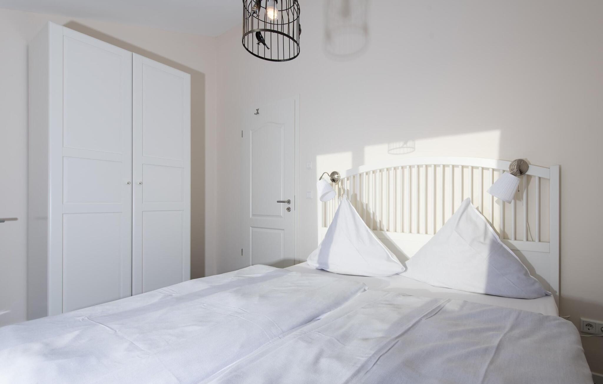 En udvendig trappe fører til huset, til den store Bankirai træterrasse, der svæver over jorden med sol hele dagen og til husets egen, helt indhegnede have. Højt til loftet og kæmpe vinduesfronter præger feriehusets indretning. Mens det åbne køkken på første niveau byder på alle bekvemmeligheder af højkvalitetsmøbler, inviterer et massivt spisebord jer til at dvæle ved den hyggelige ovn. Det første niveau flyder jævnt ind i den åbne stue på andet niveau. Herfra kan I nyde udsigten over lystbådehavnen og vandet. Et højdepunkt er det store og lyse badeværelse Dels byder glasregnskovsbruseren på en sand afslapningsoplevelse, og dels scorer en karnap point med et fritstående eventyrbadekar. Med udsigt over Østersøen og lyset fra lysekronen bliver boblebadet en uforglemmelig ferieoplevelse. Begge soveværelser på tredje niveau byder også på naturskøn udsigt over vand og natur. Og når natten kommer, kan stjernerne på himlen tælles. En komfortabel sovesofa er tilgængelig for 2 ekstra personer. En sanseligt frisk indretning, drømmende og legende, kendetegner charmen ved dette feriehus og gør det at drømme til noget helt særligt. Mens naturlige materialer og klare overflader giver den nødvendige ro, tilføjer kunstneriske dekorationer og blomstermønstre charmerende, romantiske accenter. Feriehuset Traumerei er den ene halvdel af et hus. Bemærk venligst, at denne ejendom kun er tilgængelig til leje fra lørdag til lørdag i høj- og mellemsæsonen. Kortere ophold er også muligt i lavsæsonen. Kontakt os venligst for et tilbud. Vores servicepartner, feriehusbureauet, tilbyder jer 7 topudstyrede feriehuse i drømmebeliggenhed og forskellige indretningsstile på lokationen Wackerballig.