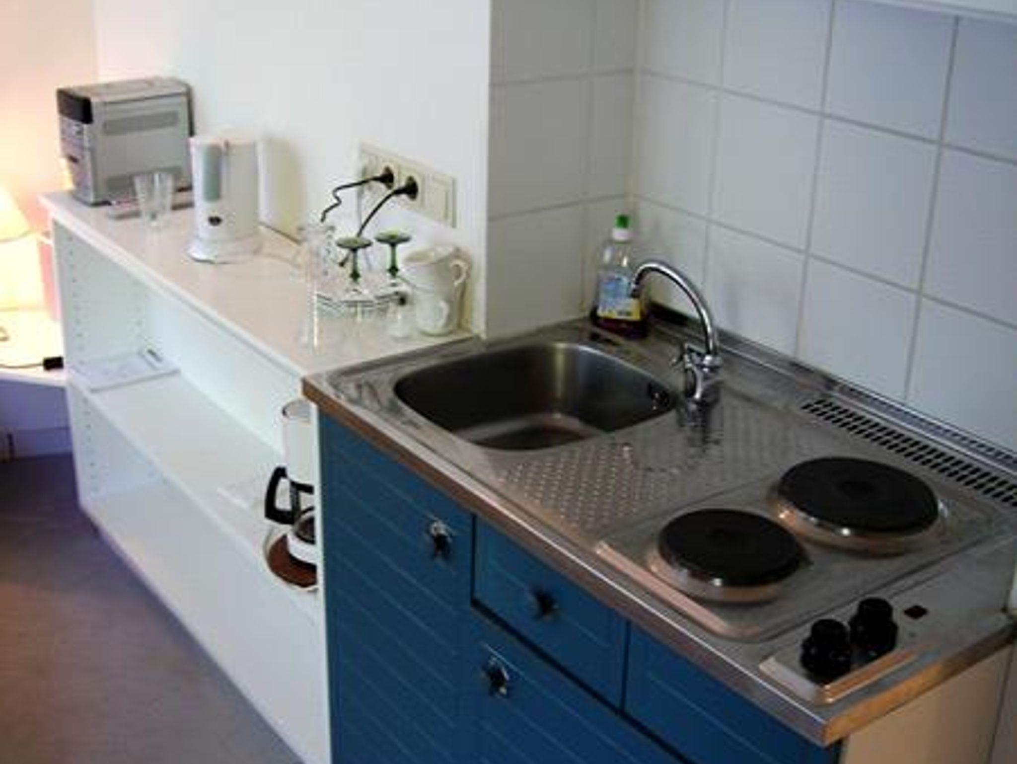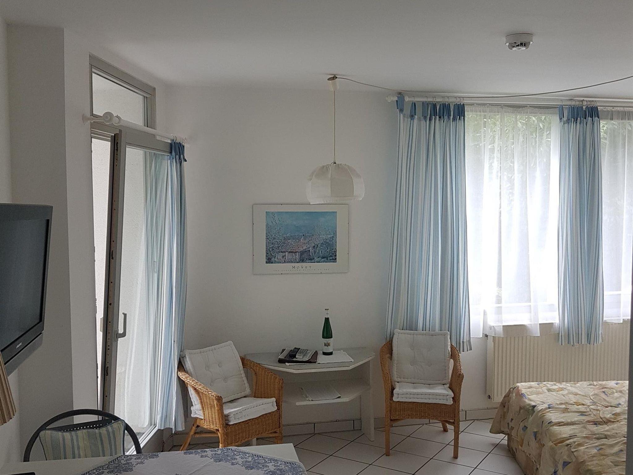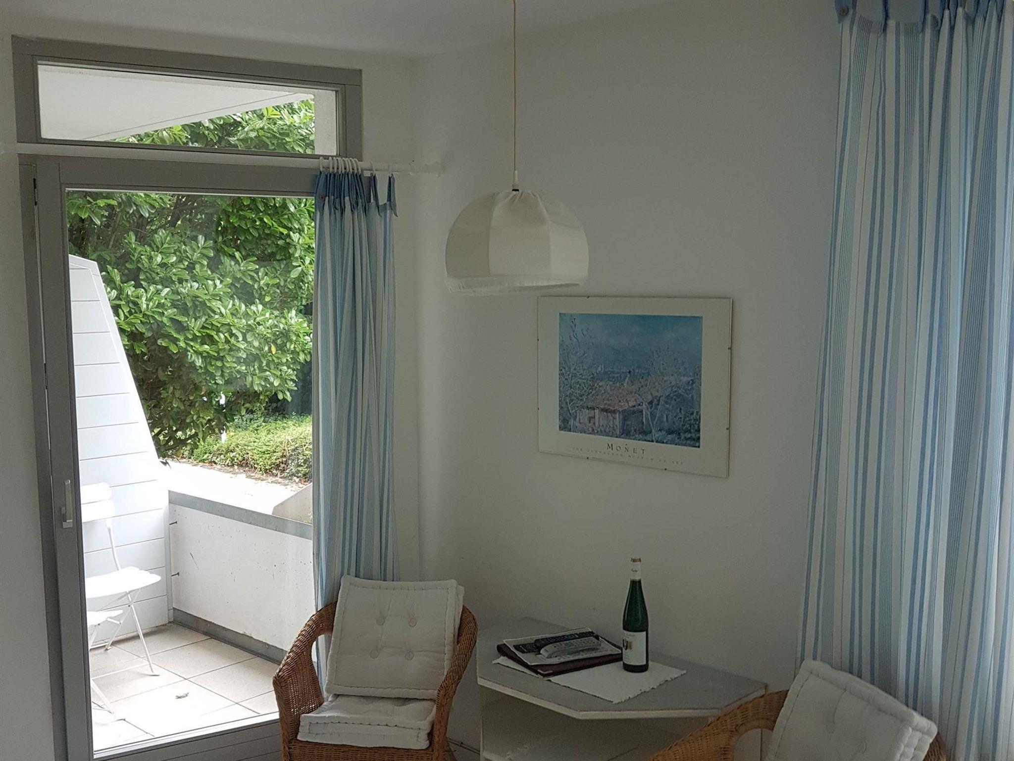 Die Ferienwohnung A12 im Erdgeschoss ist ein schönes, neumöbliertes 1-Zimmer-Appartment von 30 m², welches mit 2 Personen bewohnt werden kann. Das Wohn-/ Schlafzimmer ist mit einem Doppeldiwanbett sowie einer Pantryküche (Herd, Kühlschrank, Kaffeemaschine, Toaster, Wasserkocher) ausgestattet. Es verfügt zudem über einen Ausgang zum kleinen Balkon mit Blick ins Grüne. Bad mit Dusche und WC.