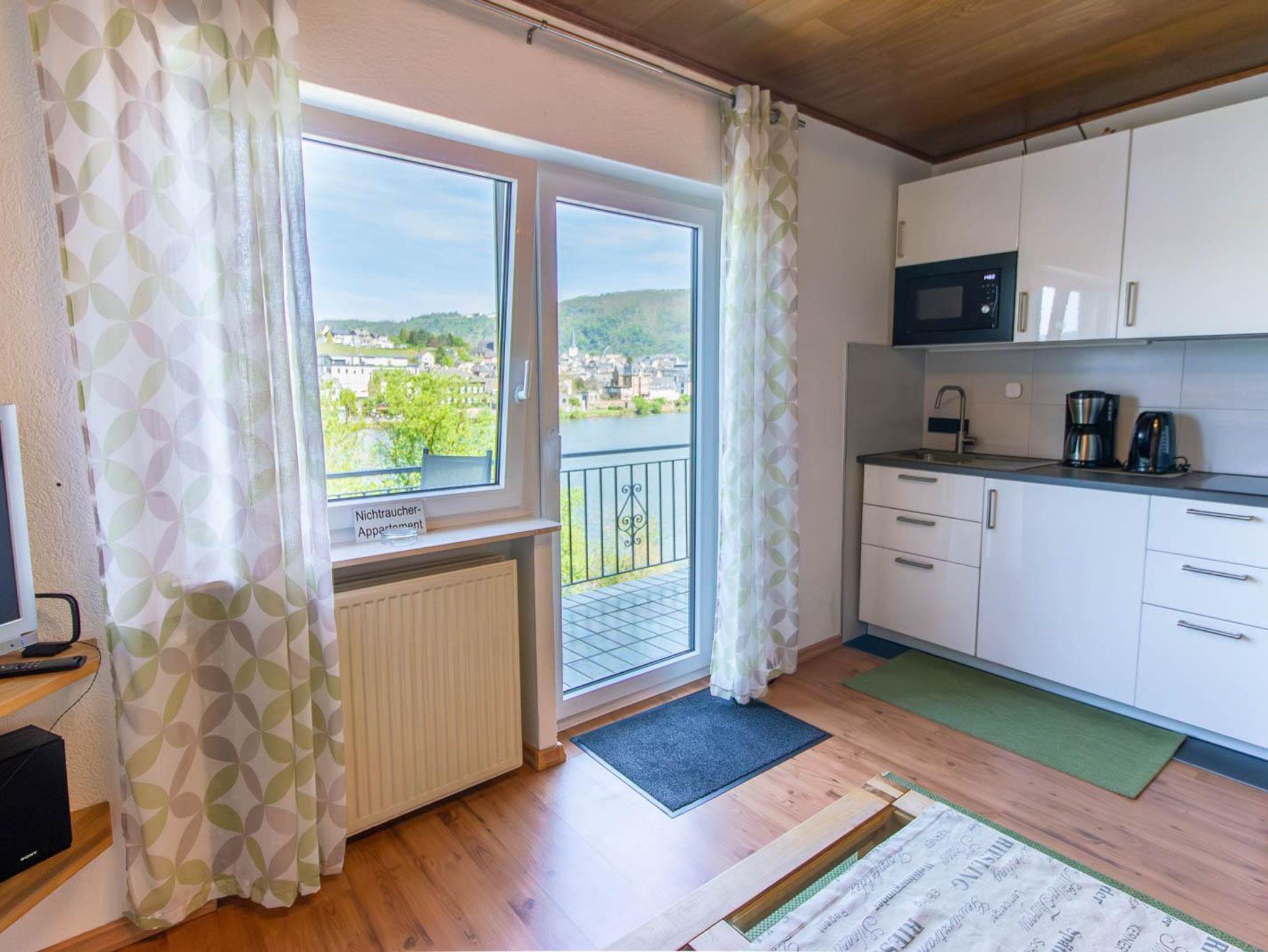 55 m² Wohnung mit Balkon zur Mosel. Wohnzimmer, Kochnische, SAT-TV. 1 Doppelschlafzimmer, Badezimmer mit Dusche/WC