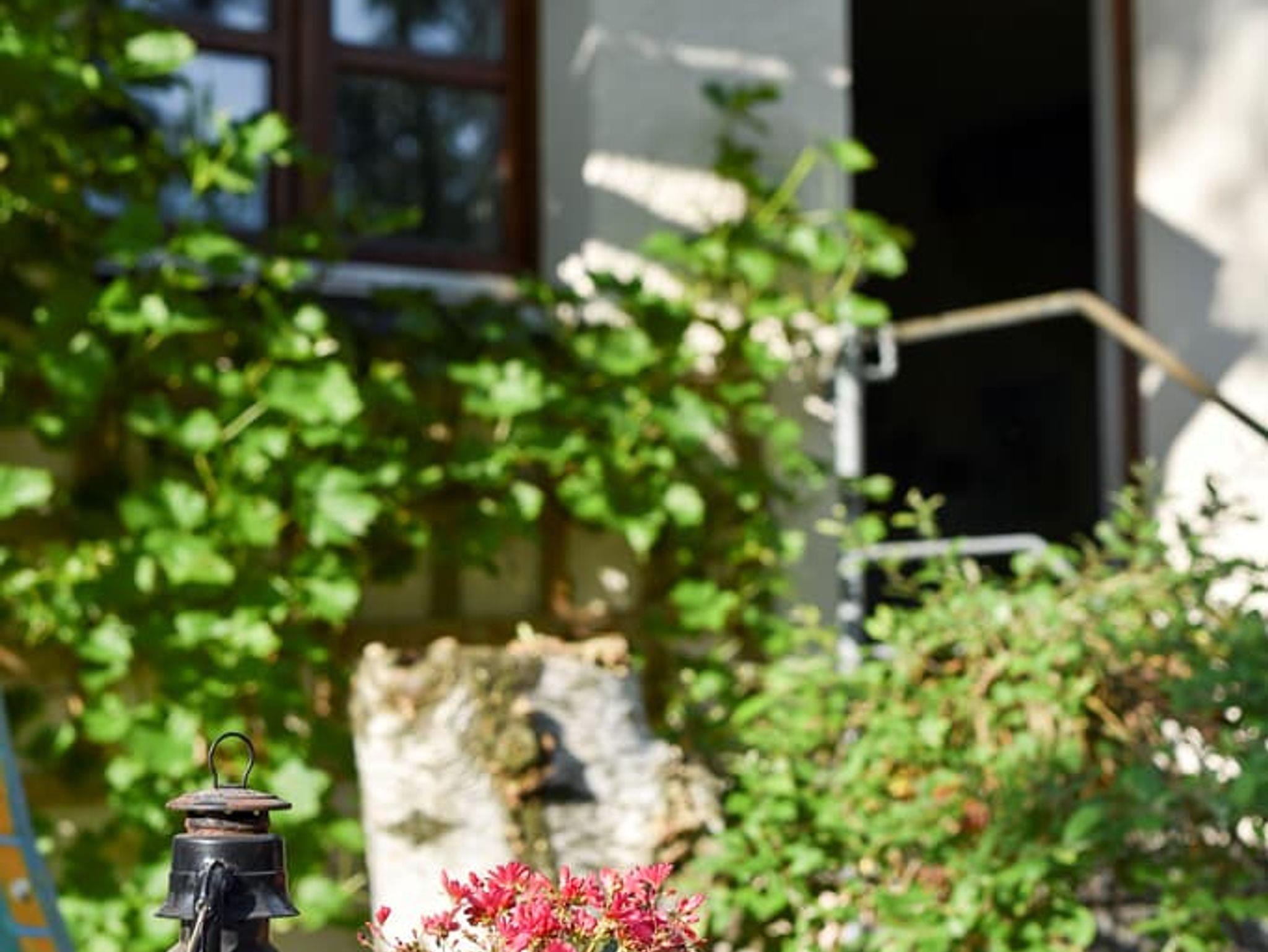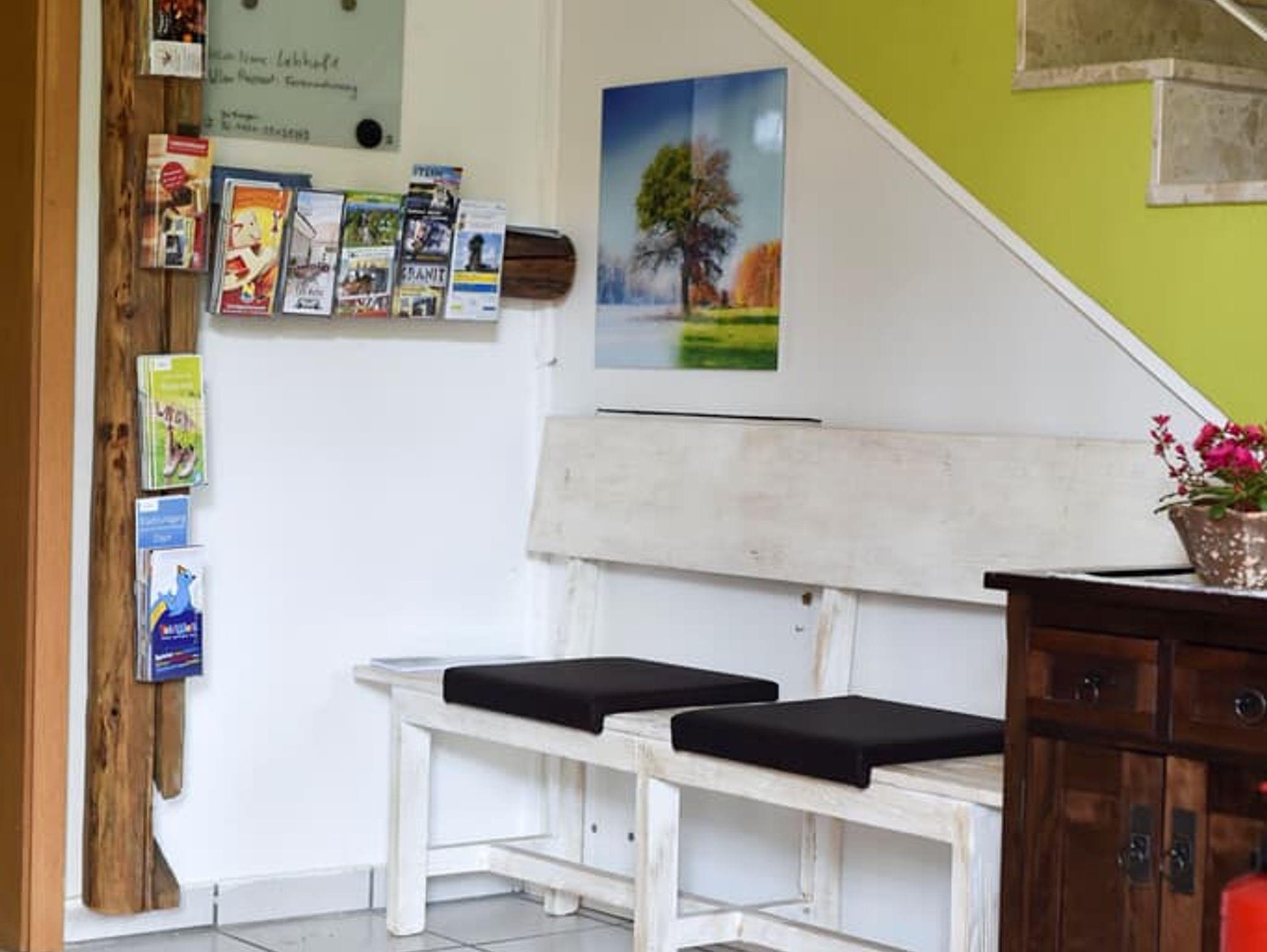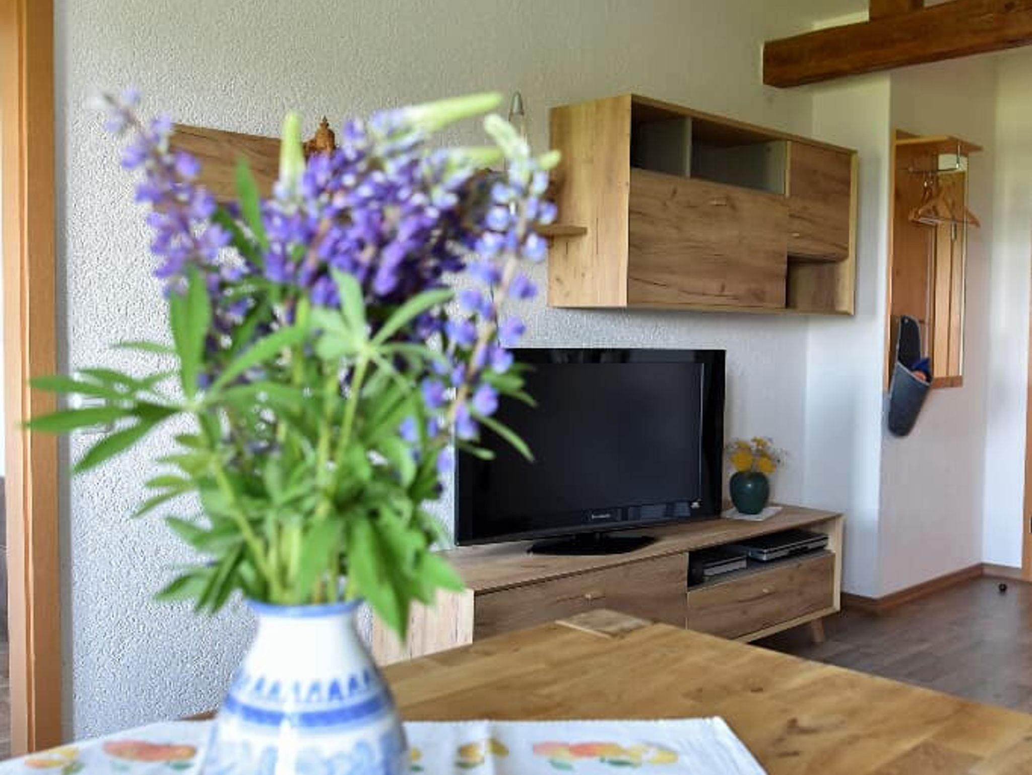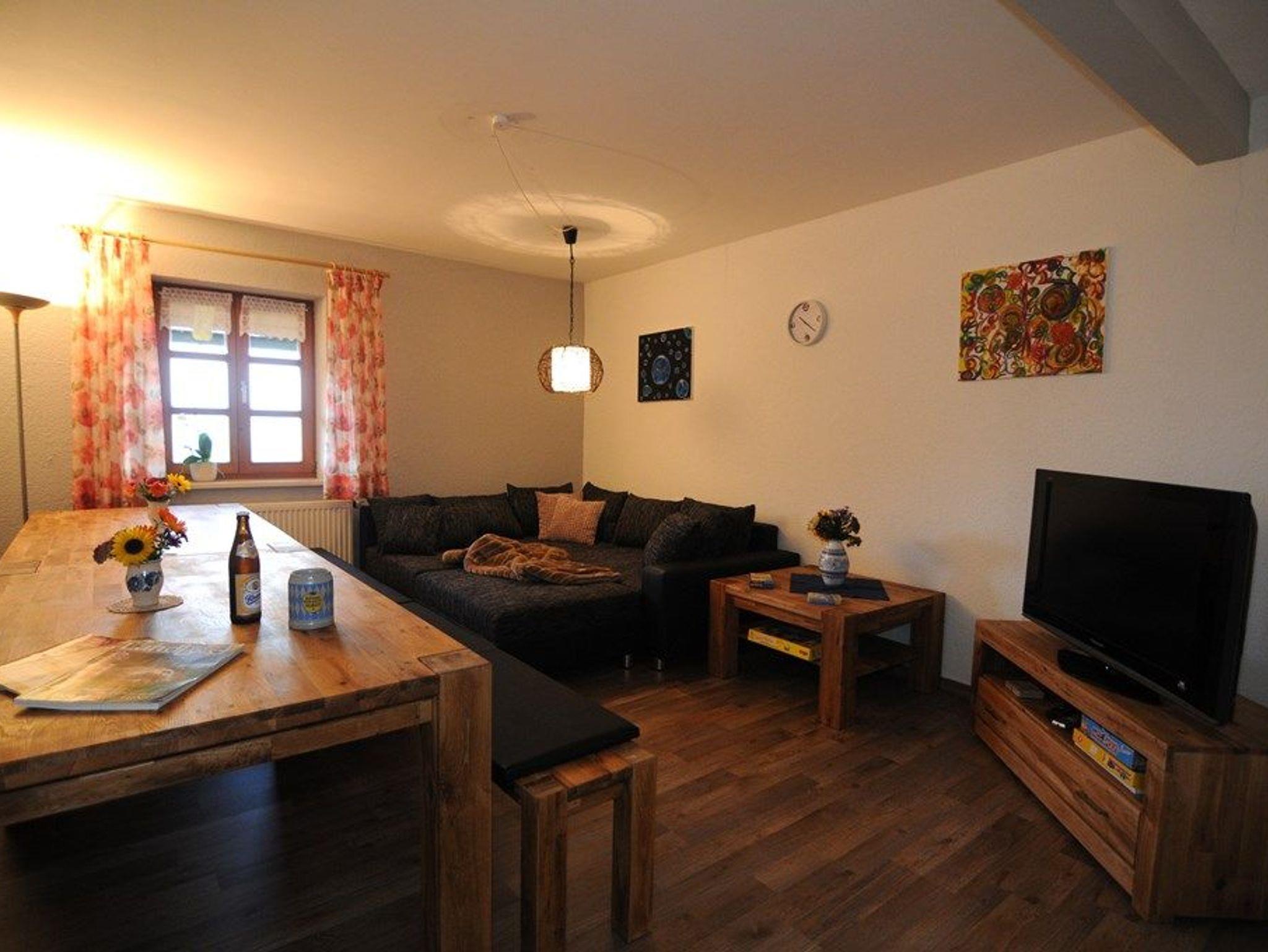 Helle, renovierte, freundliche Ferienwohnung (50qm, Obergeschoss) mit schöner Aussicht. Die Wohnung ist ideal für zwei Erwachsene evtl. mit einem Kind. Im großem Schlafzimmer befindet sich ein Boxspringdoppelbett mit offenem Fußteil das bei Ihrer Anreise bezogen ist, sowie Platz für ein Zustellbett. Im Bad befindet sich eine Badewanne/Dusche inklusiv und WC, es liegen Bad-und Handtücher und ein Fön für Sie bereit. Im gemütlichen Wohn-/Essbereich befindet sich eine große Eckcouch die mit TV und Musikanlage zum entspannen einlädt. Die Küchenzeile ist mit Cerankochfeld und Backofen, einem Kühlschrank mit Gefrierfach und Kaffeemaschine/Wasserkocher/Toaster praktisch ausgestattet. Für Sie vorbereitet sind Spül- und Geschirrtücher. In der großen Scheune findet sich genug Platz für die kostenlose Unterstellung Ihre Fahrräder oder Motorräder.