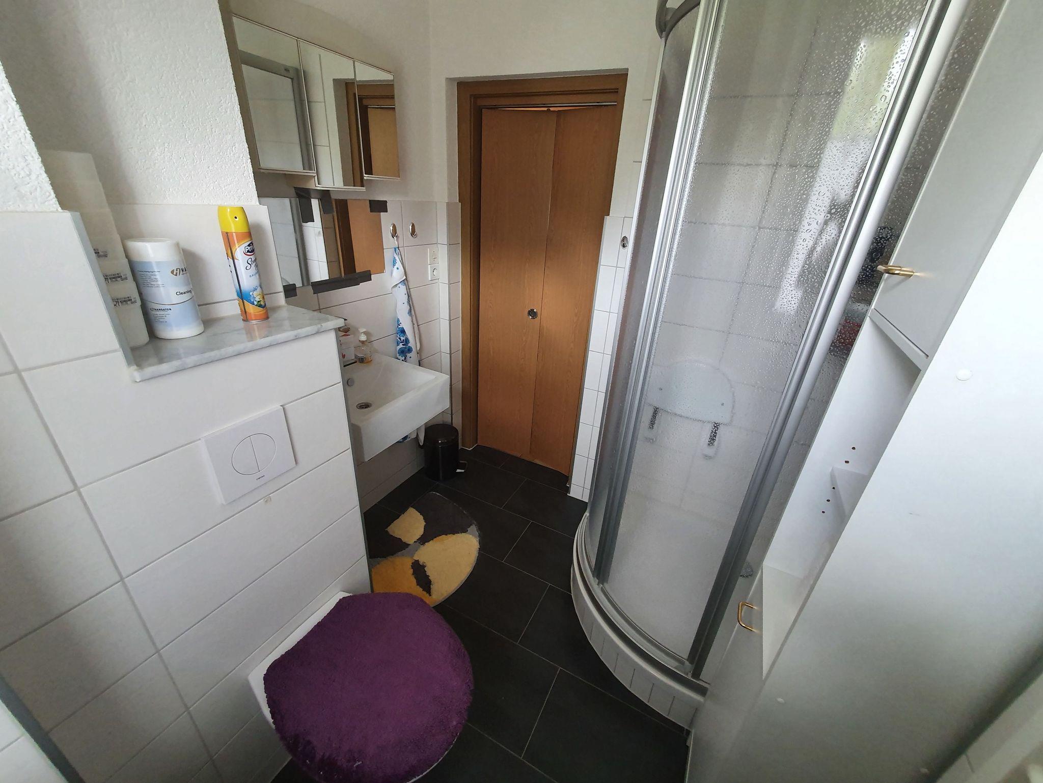 Das Bad verfügt über eine Dusche, WC und Hygieneartikel.