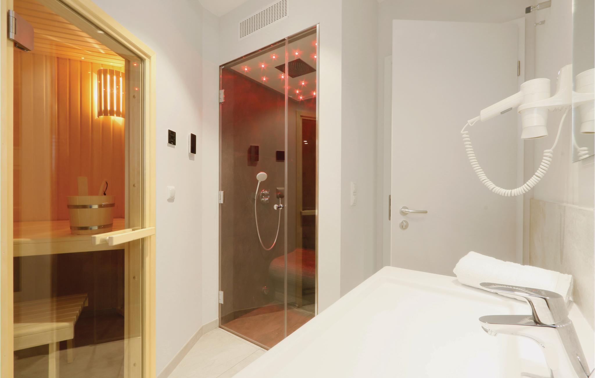 Noget særligt er badeværelset, der er jeres helt personlige lille wellnessområde med sauna og dampbad med integreret dobbelt regnskovsbruser. Her kan I slappe af og lade tankerne glide på langfart, glemme alt om hverdagens problemer og lade de flade batterier op igen. Ikke nok med det, når badet er slut kan I sætte jer foran de flakkende flammer i bioetanol-kaminen som giver et hyggeligt lys. Den bekvemme sofa lader sig nemt forvandle til to bekvemme sovemuligheder.