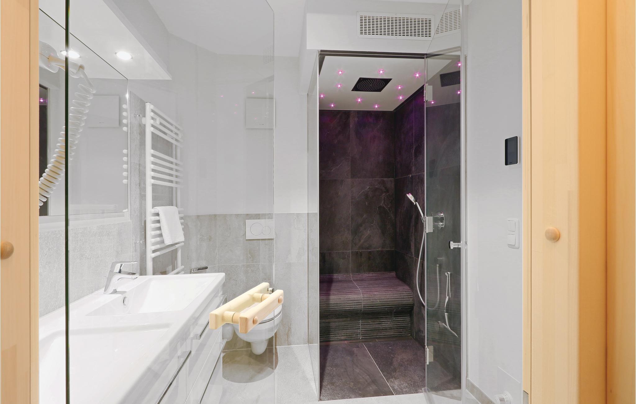 Badeværelset er et rent wellnessparadis. Her er der infrarød sauna og dampbad med regnbruser. Lejligheden er udstyret med moderne underholdningssystem med Blu-ray-afspiller, fladskærms-tv og et musikanlæg hvorfra I kan streame.