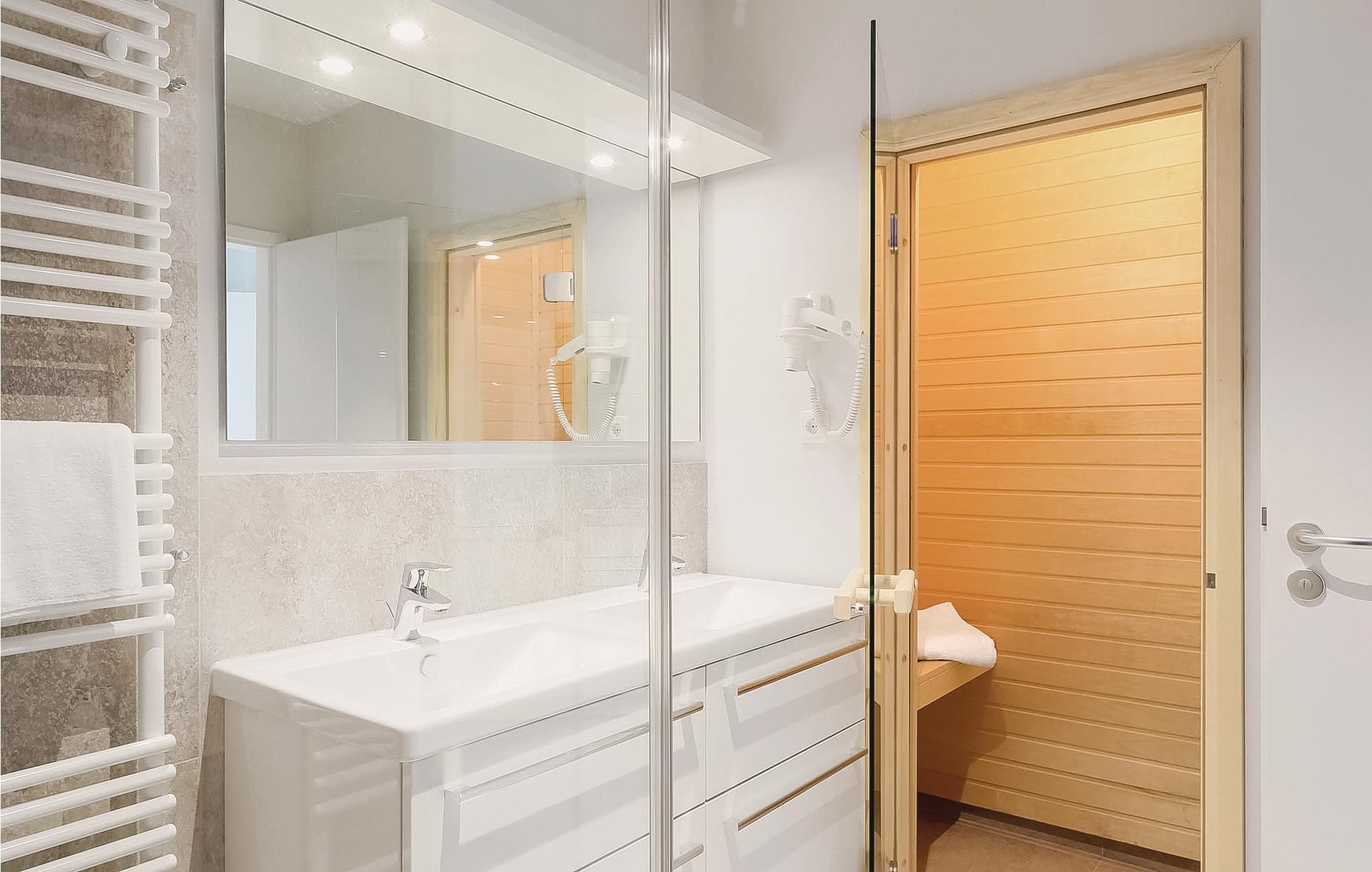 Badeværelset er et rent wellnessparadis. Her er der infrarød sauna og dampbad med regnbruser. Lejligheden er udstyret med moderne underholdningssystem med Blu-ray-afspiller, fladskærms-tv og et musikanlæg, hvorfra I kan streame.