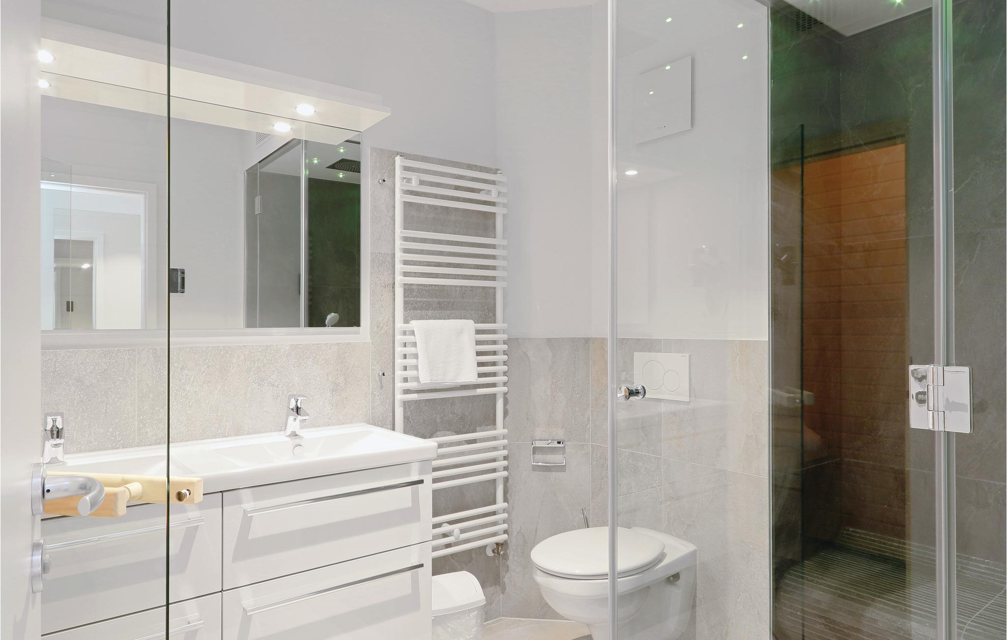 Badeværelset er et rent wellnessparadis. Her er der infrarød sauna og dampbad med regnbruser. Lejligheden er udstyret med moderne underholdningssystem med Blu-ray-afspiller, fladskærms-tv og et musikanlæg, hvorfra I kan streame.