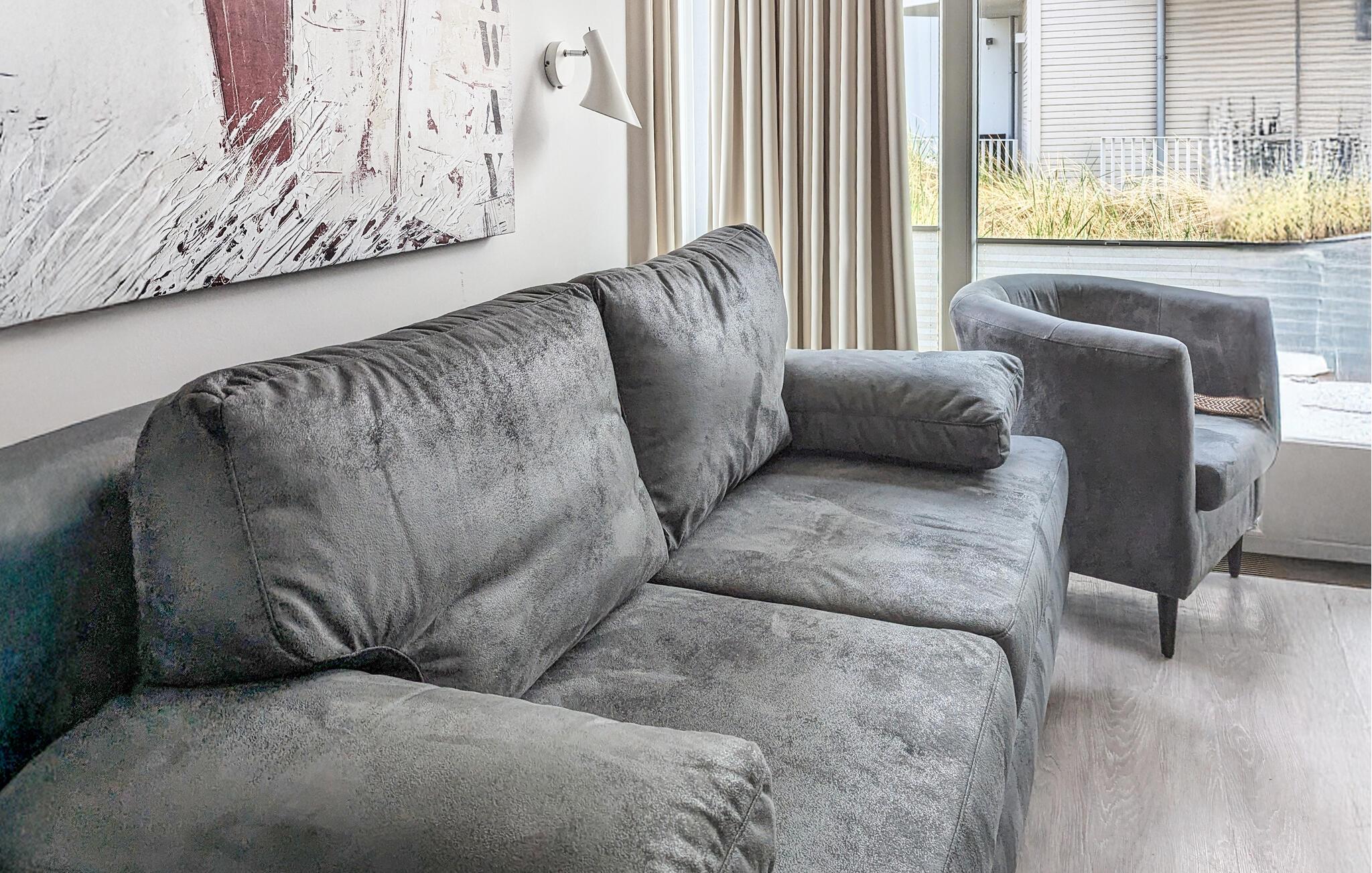 I opholdsstuen er der en glaskarnap, som sørger for ekstra lysindfald. Her finder I også køkkenhjørnet, sovesofaen samt biokaminen, som bidrager til en hyggelig atmosfære i rummet. Den overdækkede terrasse kan tilgås fra det separate soveværelse. Her kan I sidde og spise jeres morgenmad eller bare nyde den friske østersøluft.