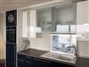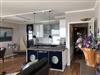 Küche: offene, hochwertig eingerichtete Einbauküche mit Spülmaschine, 4er Induktionskochfeld mit integriertem Dunstabzug, Backofen, Kühlschrank mit Gefrierfach, Kaffeemaschine, Toaster und Wasserkocher.