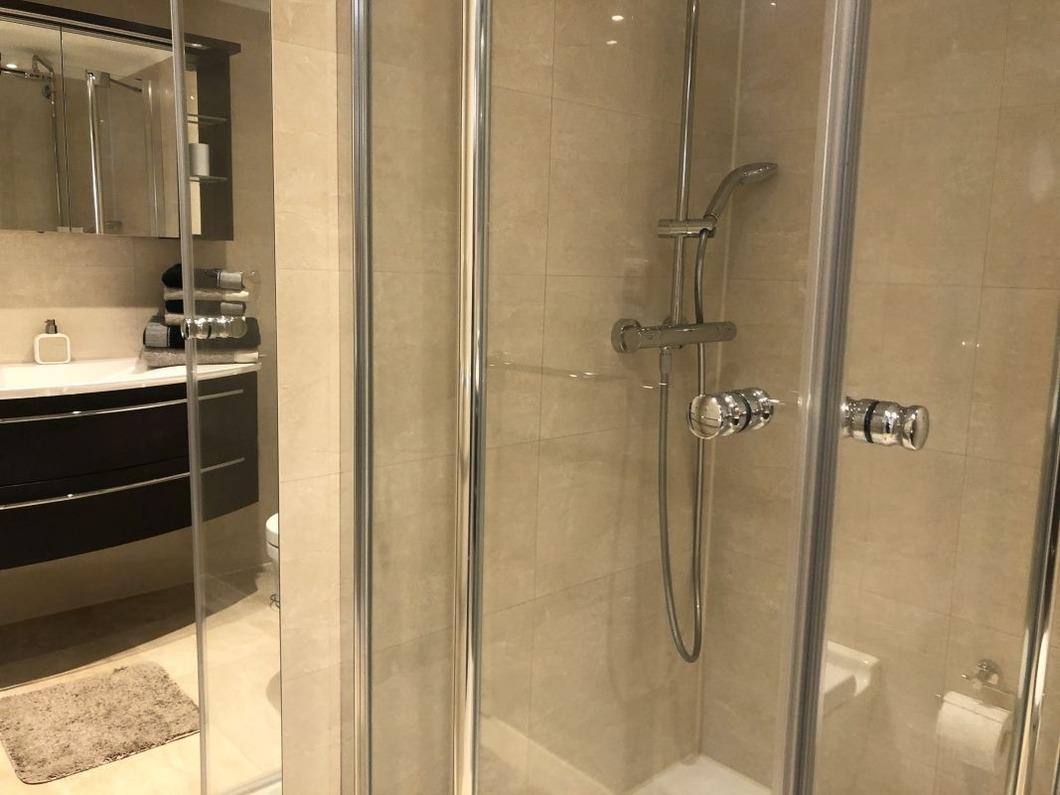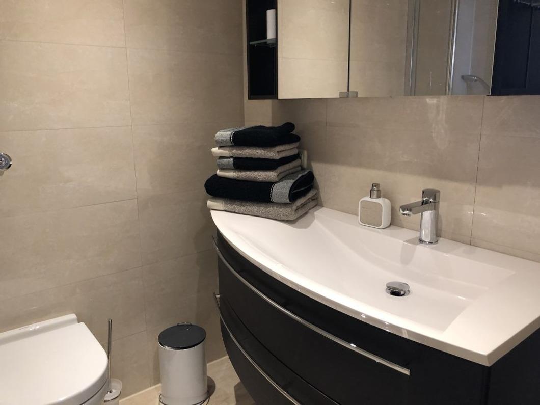 Bad: hochwertiges Duschbad mit WC, niedrigem Duscheinstieg, Waschtisch mit Badmöbeln und Spiegel-Heizkörper