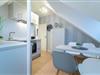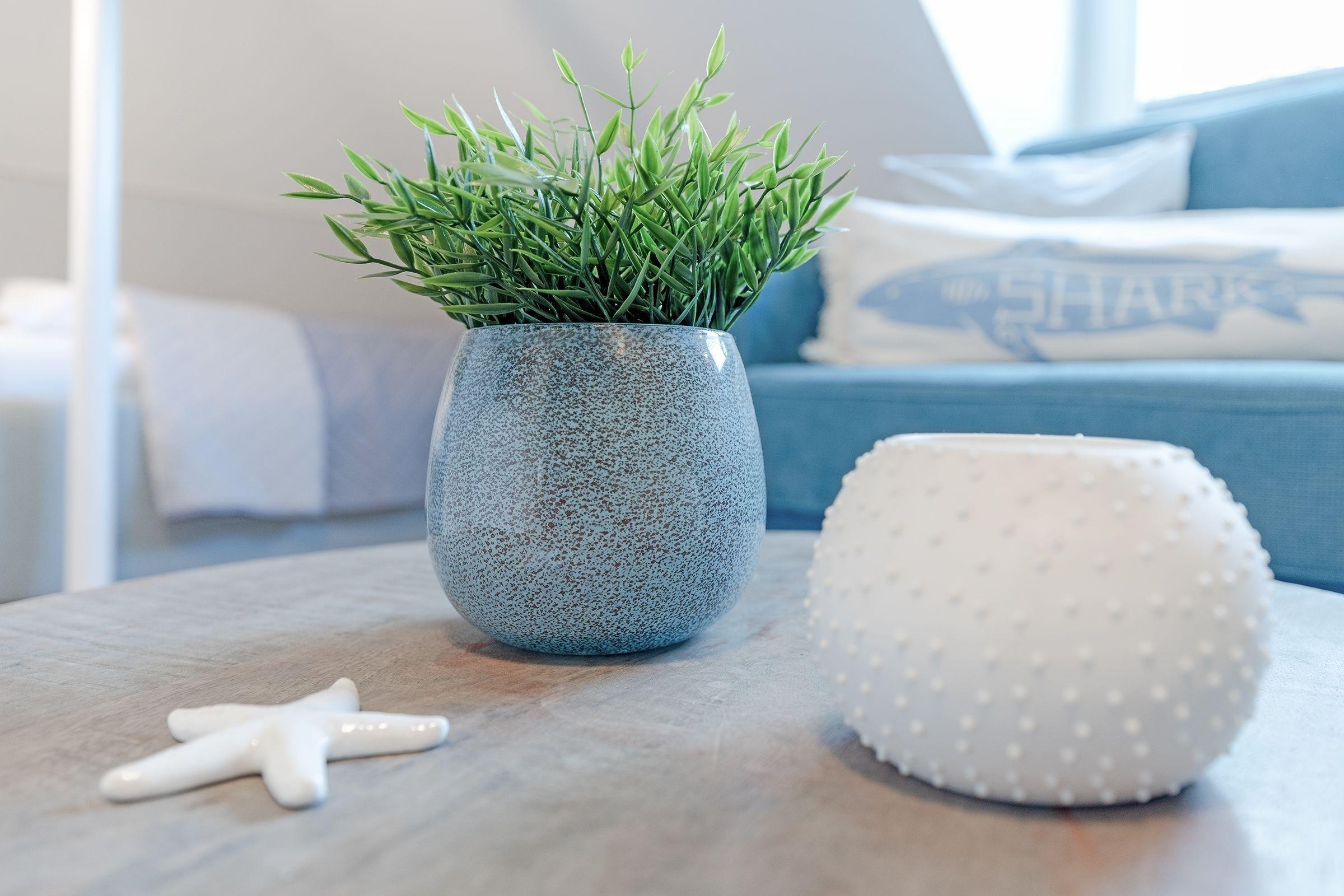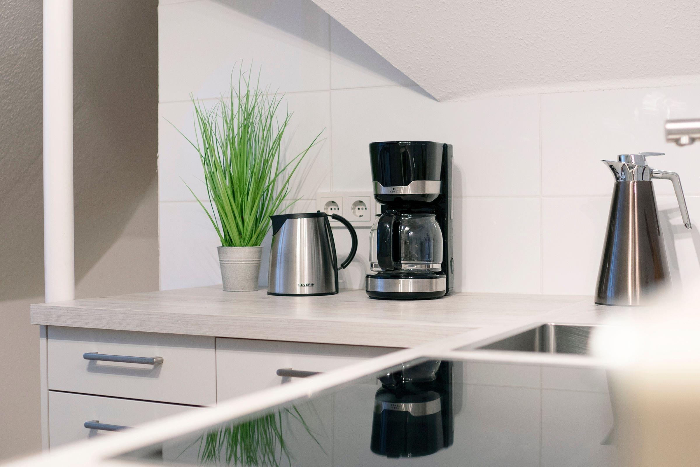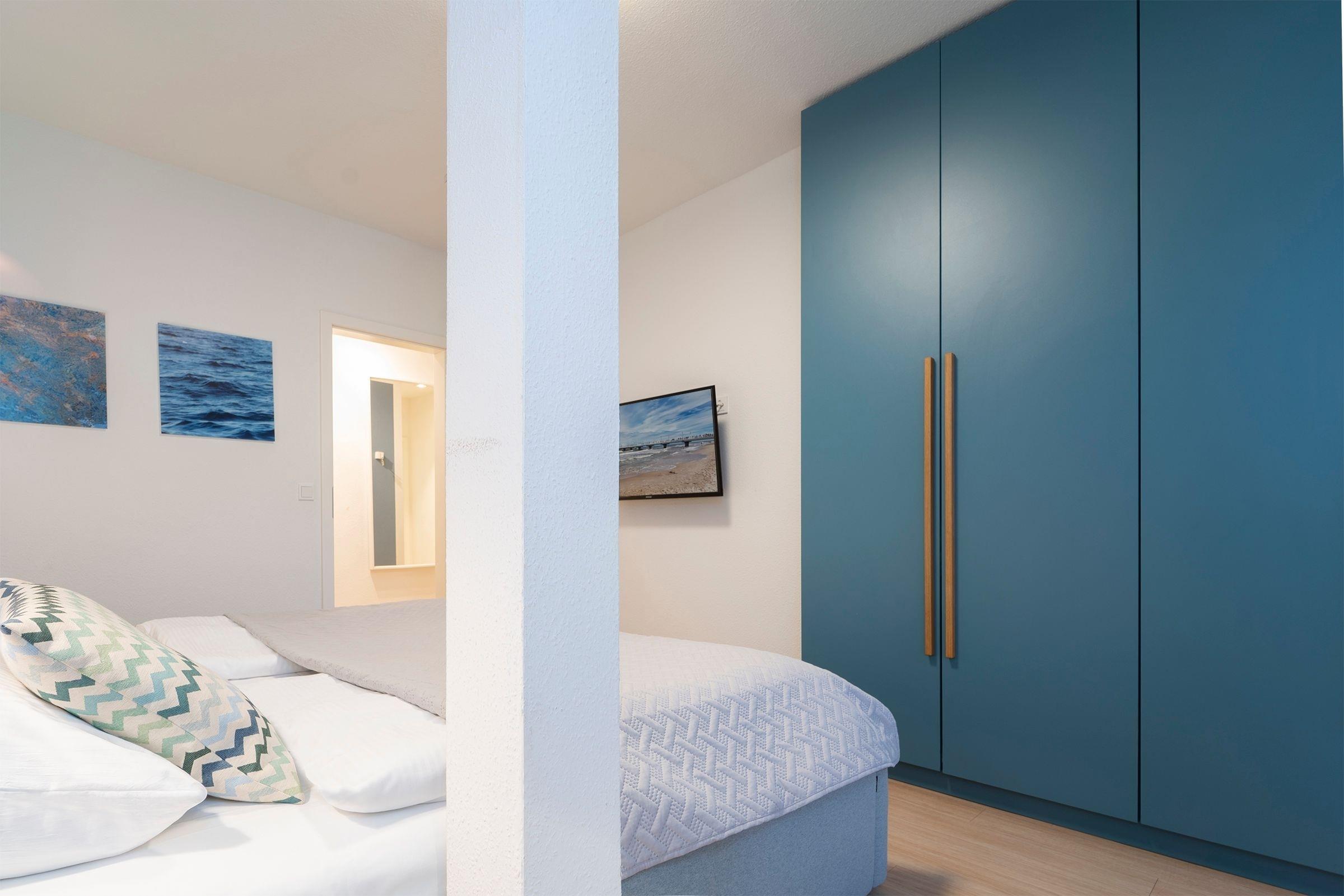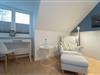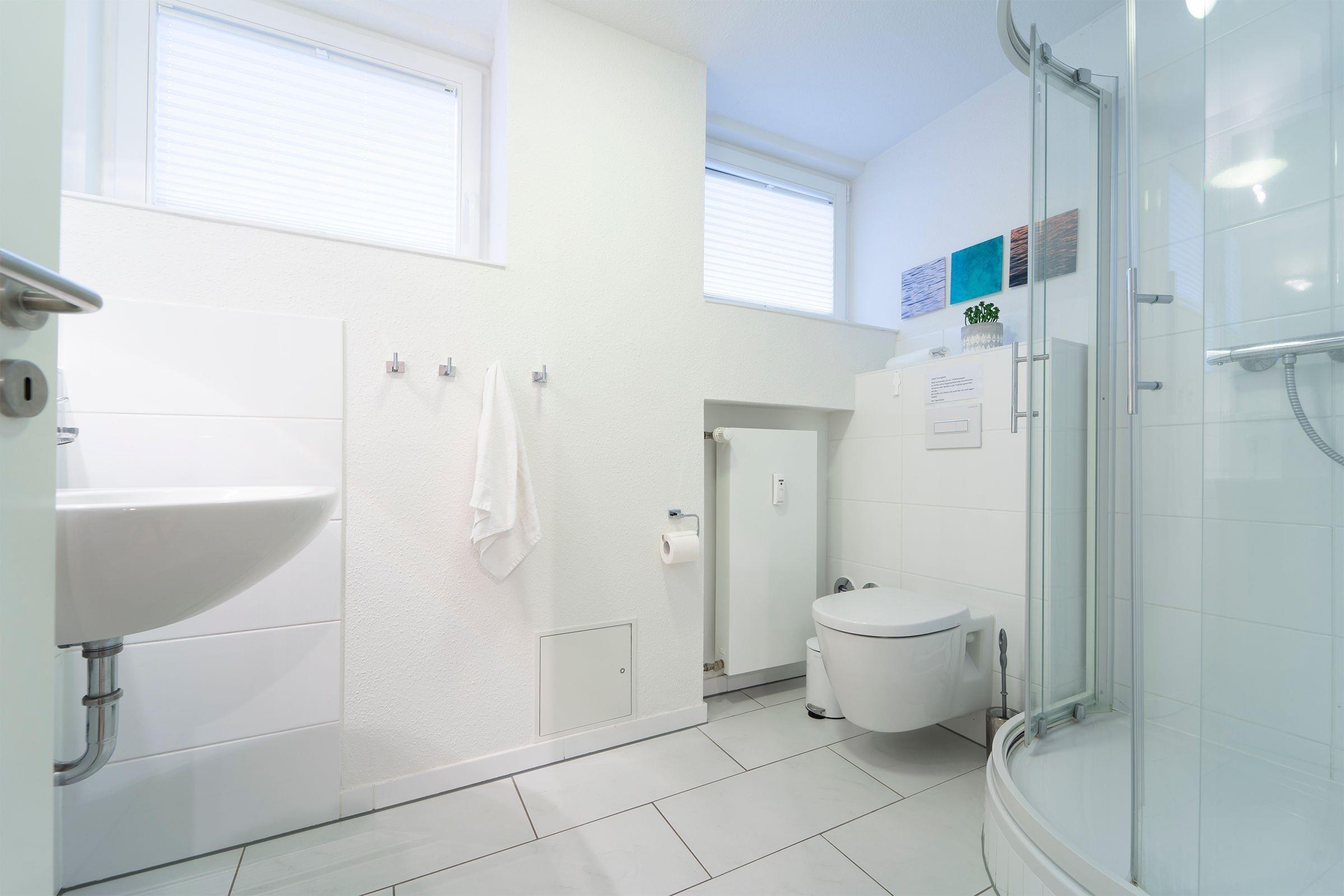 Das modern eingerichtete Schlafzimmer erreichen Sie vom Flur. Ein Boxspringbett (180x200 cm), ein Kleiderschrank und ein weiterer Flat-Screen TV gehören zur Ausstattung. Nach ausgiebigen Spaziergängen nur einmal kurz die Beine hoch legen oder ganz entspannt dem Fernsehprogramm aus dem bequemen Relaxsessel folgen. In Ihrem Wohnbereich werden Sie sich wohlfühlen. Es erwartet Sie dort eine bequeme Couch, ein Flat-Screen TV und ein zusätzlich kuscheliges Bett (90x200 cm). Verdunklungsplissees an allen Fenstern - der perfekte Licht-, Sicht,- und Sonnenschutz. Zum gemeinsam Kochen lädt die separate Küche mit einem Essbereich ein. Das moderne Duschbad mit Handtuchwärmer, Föhn und WC rundet den Anspruch dieser Ferienwohnung ab. Außerdem sorgen die schrägen Wände für ein heimeliges Gefühl. Die Internetnutzung ist über W-LAN kostenlos möglich.