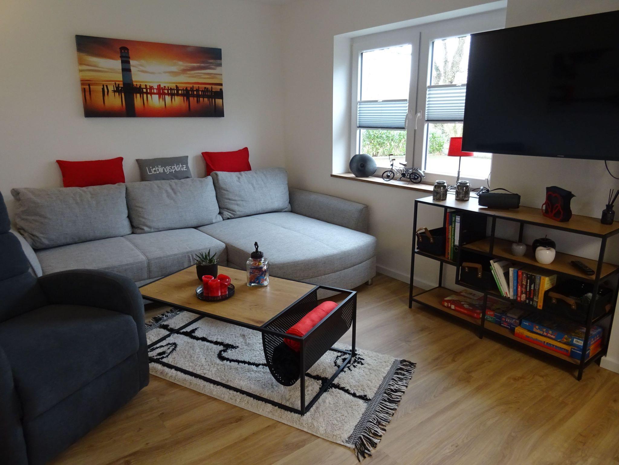 In 2022 vollständig renovierte Ferienwohnung in einer Doppelhaushälfte mit Lage im Grünen, ca. 70 qm, mit moderner und neuwertiger Ausstattung. Im Erdgeschoss befindet sich ein offener Wohn- und Essbereich mit gut ausgestatteter Einbauküche, ein großer Esstisch sowie ein gemütliches Sofa mit Flachbild- TV, Bluetooth-Lautsprecherbox und Spieleregal für die Kleinen. Von diesem Wohnbereich gelangen Sie auf die überdachte Terrasse und in den Garten. Des Weiteren befindet sich im Erdgeschoss ein Badezimmer. Es besticht durch eine ebenerdige Dusche mit Regenwaldduschkopf, einem Waschtrockner und das schöne Mobiliar. Eine Ausstattung für Kleinkinder (Wickelmöglichkeit, Töpfchen, Hocker und ein Toilettensitz) ist vorhanden.