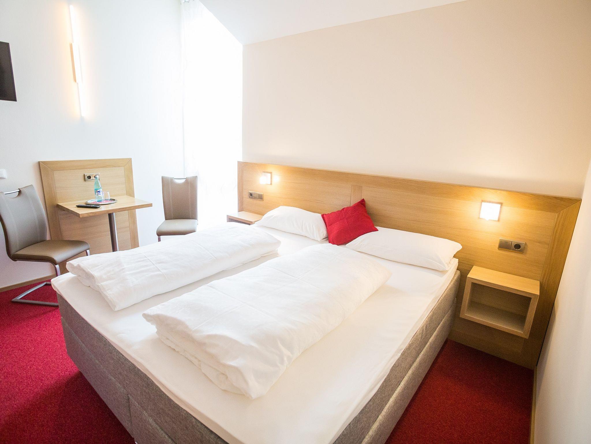 Das moderne Doppelzimmer verfügt über ein bequemes Doppelbett, Fernseher, Föhn, Lärmschutzfenster, WLAN und ein Bad mit Dusche/WC.