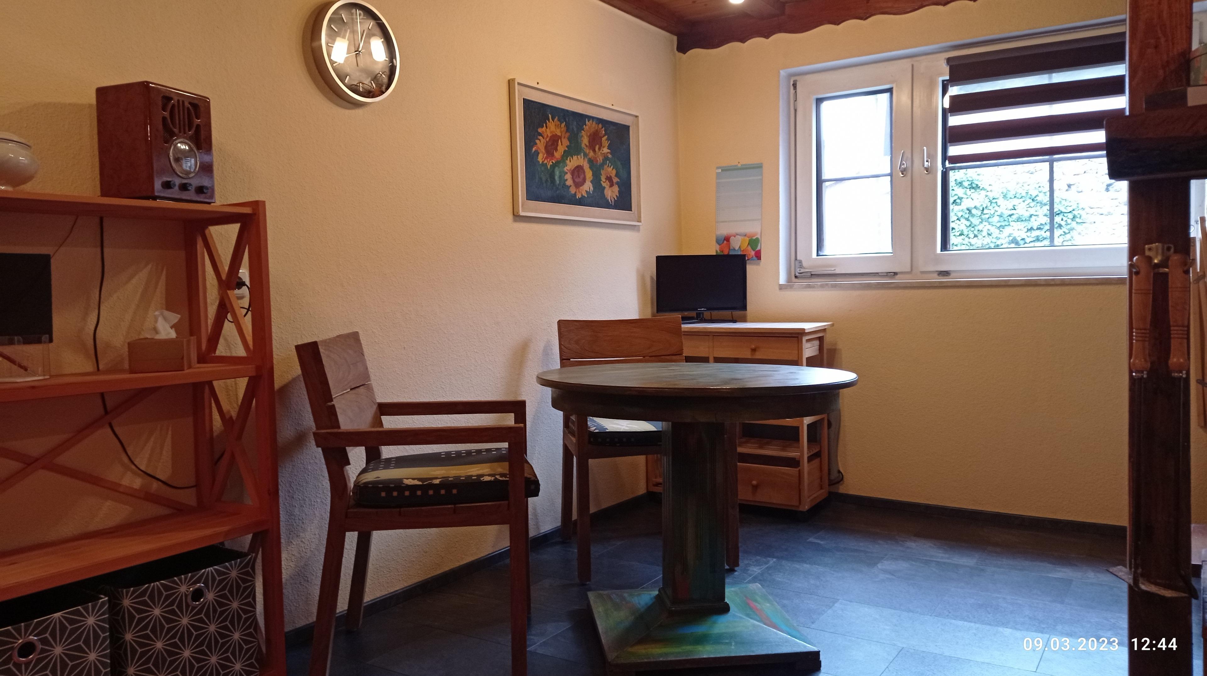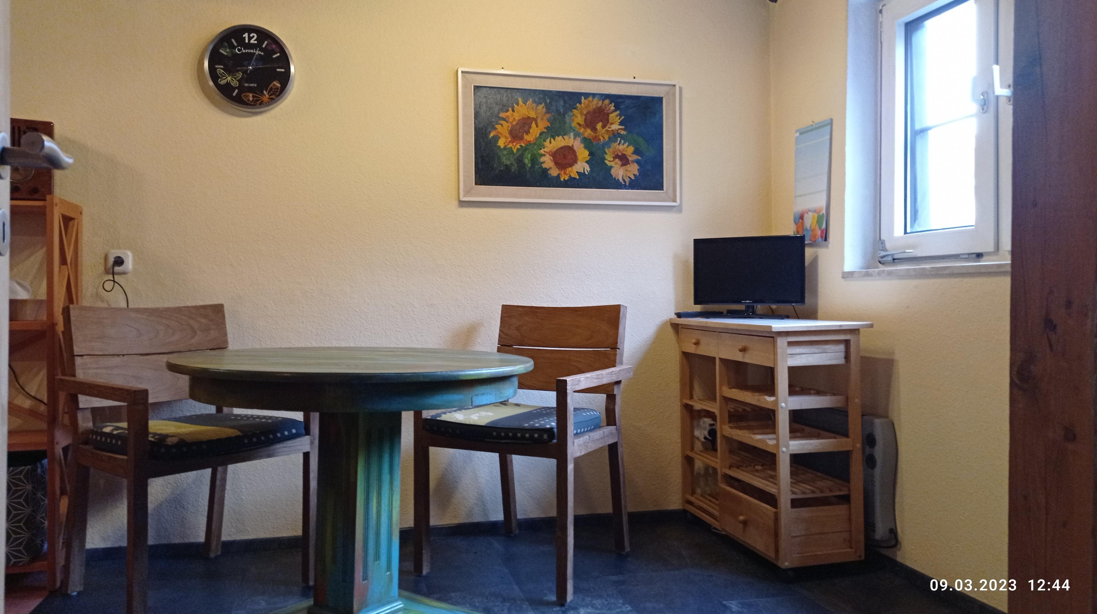 Verteilt auf 48qm, befindet sich in der unteren Etage ein Tageslichtbad mit Dusche/WC und Waschbecken, ein Abstellraum mit Waschmaschine. Eine gemütliche Landhausküche mit E.-Herd (Ceranfeld und Backofen), Kühlschrank mit 3 Sterne Gefrierfach, eine Spülmaschine und eine Mikrowelle. Holzofen und Essecke.