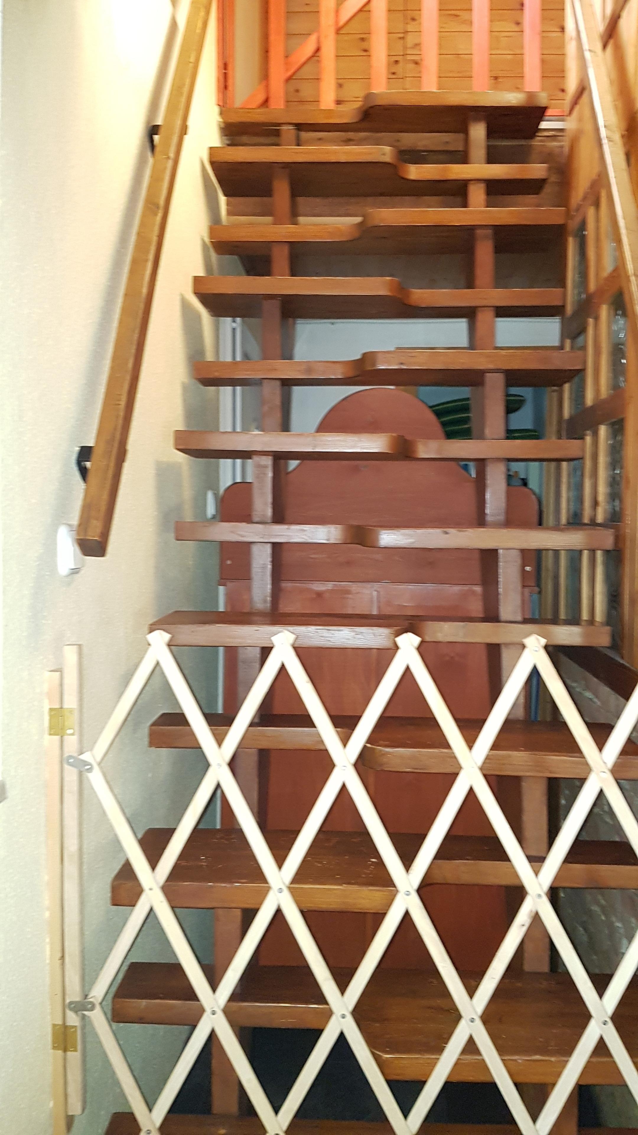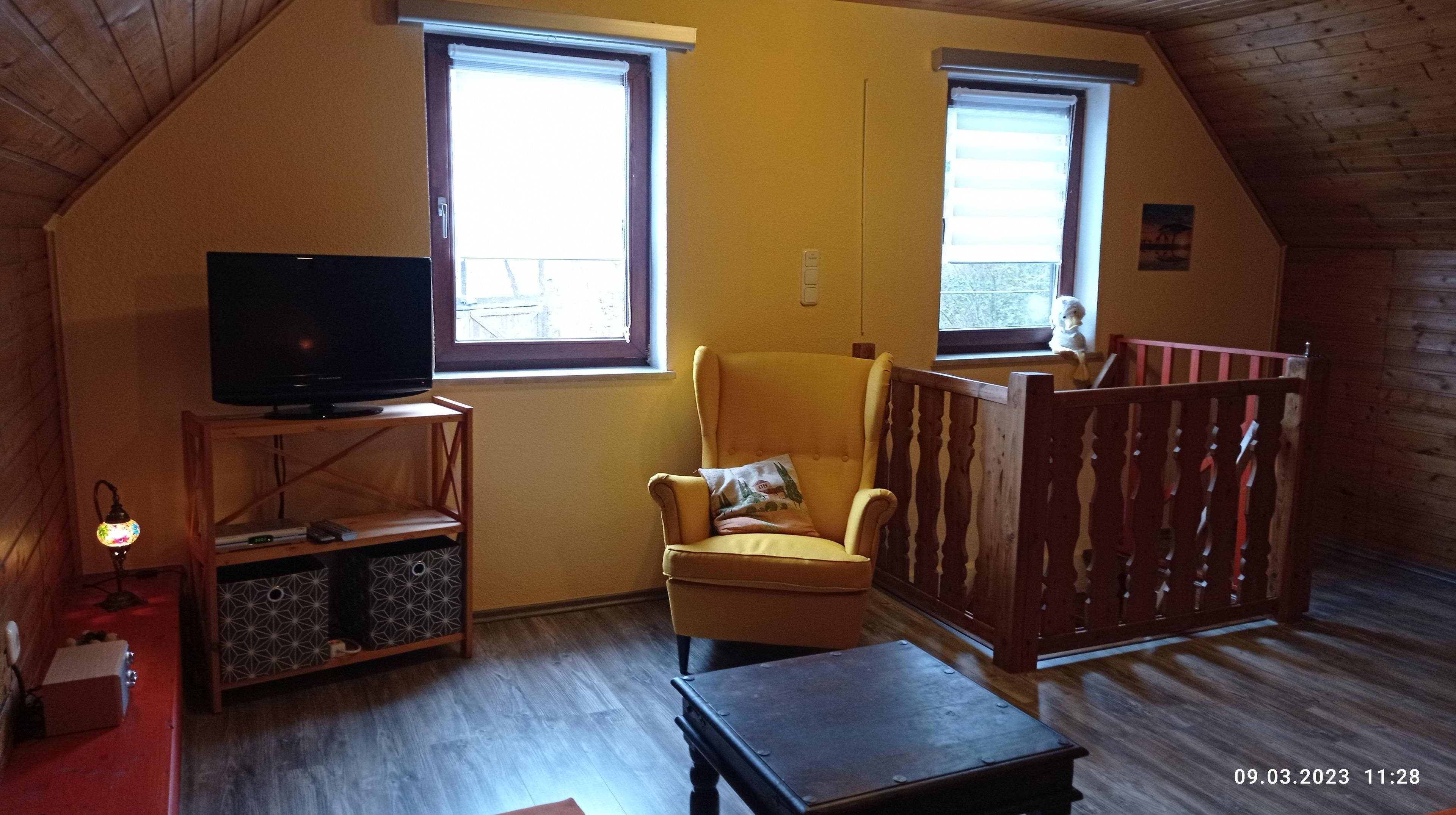 Über eine Raumspartreppe (sehr steile Holztreppe mit halben Stufen) geht es ins Obergeschoß mit Wohn-/Schlafraum, Doppelbett und Kleiderschrank. Couchecke mit Fernseher. Zusätzliche Elektroheizungen in Bad, Küche und Wohnraum.