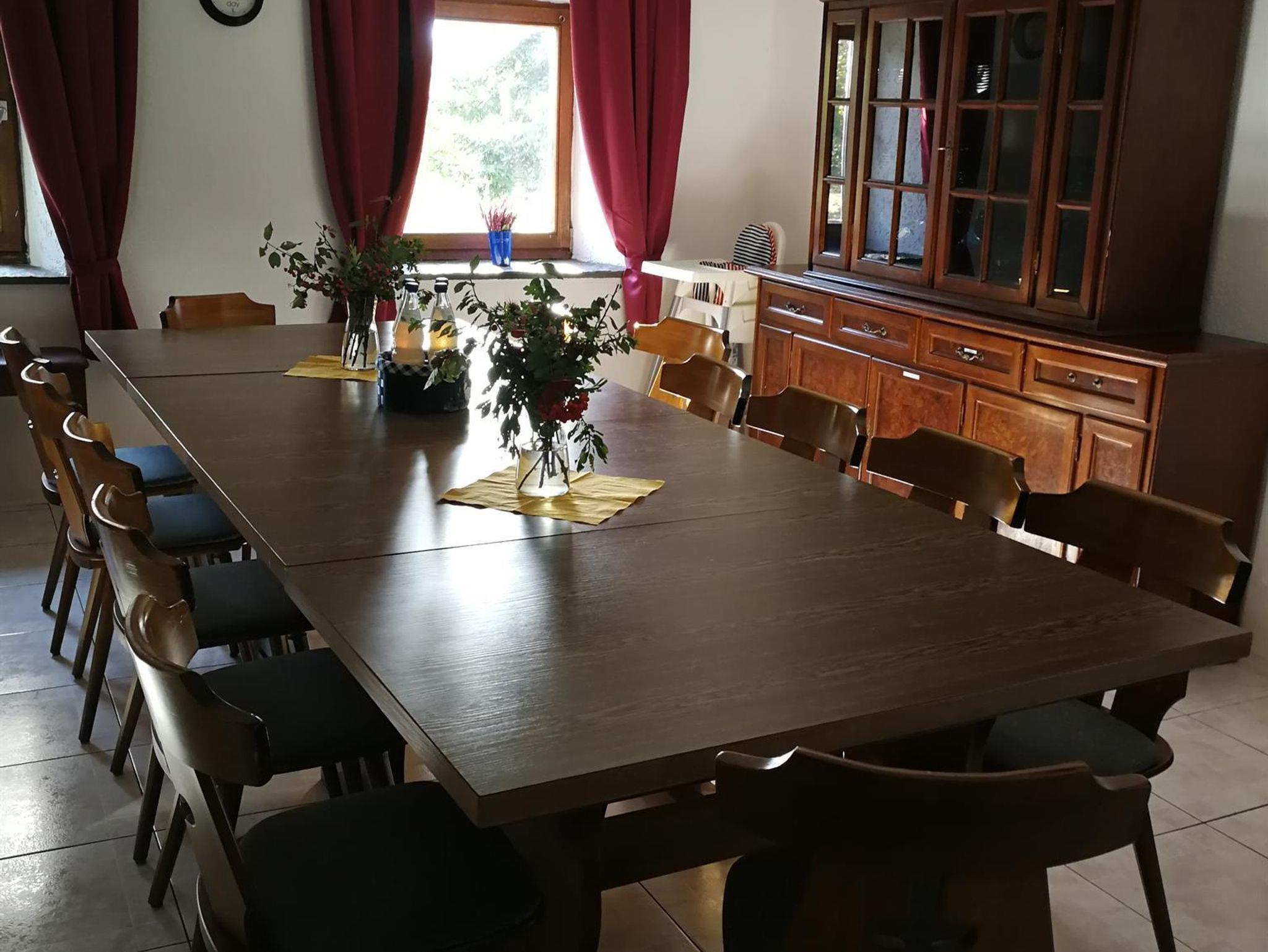 Saal: lange Tafel mit 14 Sitzplätzen, Gesellschaftsspiele, Schlafsofa, Kachelofen