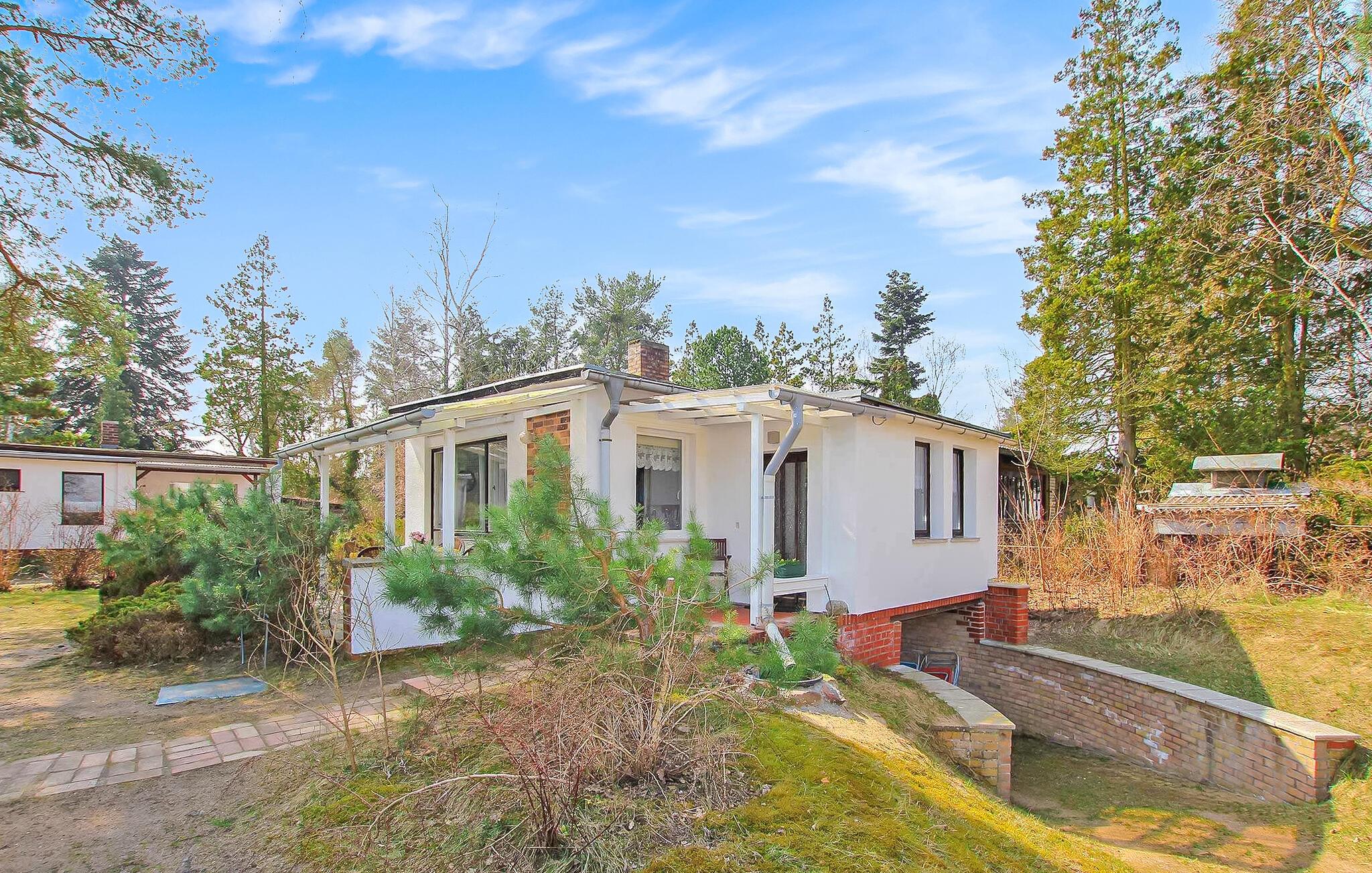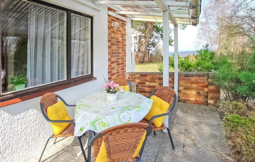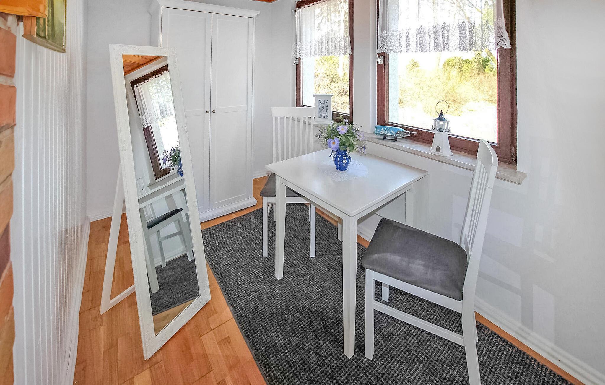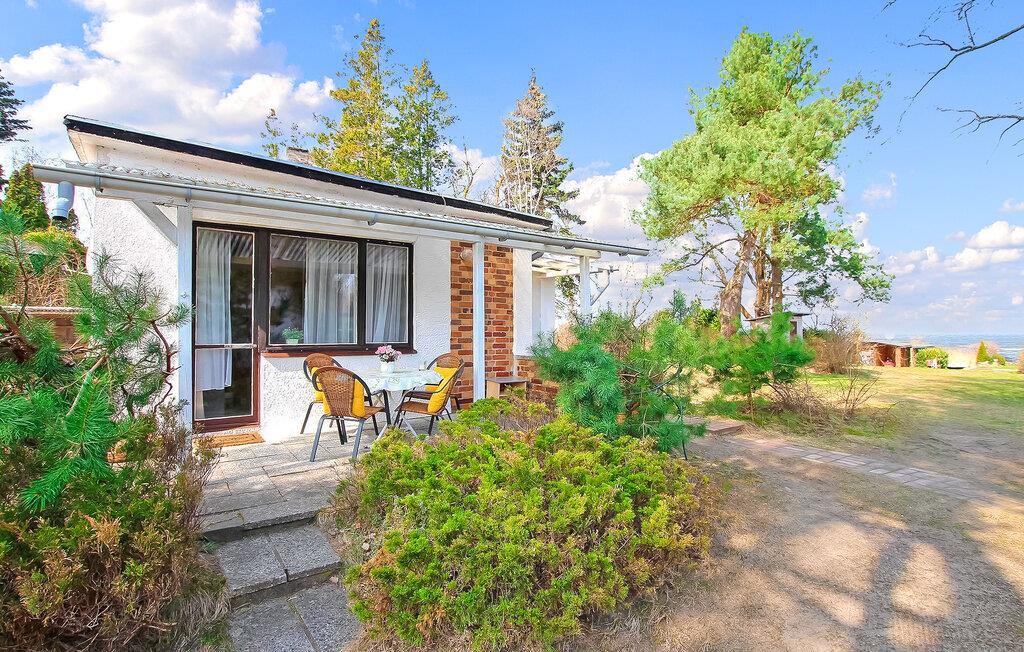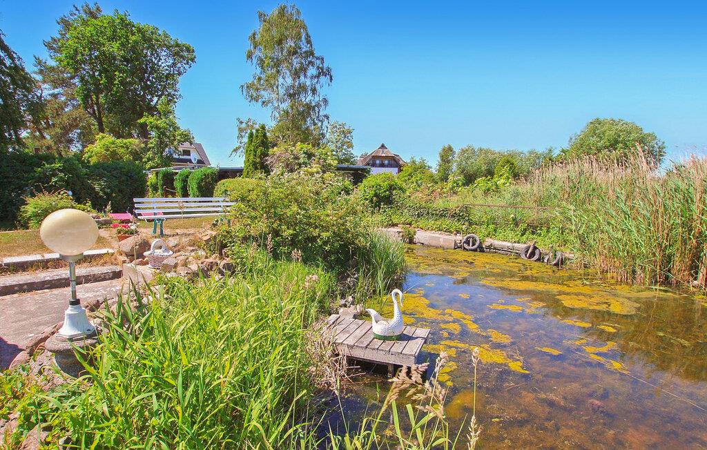 De otte feriehuse ligger på en 2500 kvadratmeter stor natur-/vandejendom direkte ved Szczecin-lagunen. Hvert sommerhus er individuelt og separat. En sti fører fra ejendommen direkte til stranden (ca. 50 m). Alle feriehuse har en møbleret terrasse eller et udendørs opholdsområde med grill og en parkeringsplads direkte ved bungalowen. Dette feriehus er udstyret med opholdsstue med sovesofa, opholdsområde og pejs, soveværelse med dobbeltseng, spisestue, tekøkken med el-komfur, bad/toilet, elvarme. Det er lige ved vandet. En robåd, en tømmerflåde og en overdækket terrasse lige ved vandet med grill, rygeområde og bålplads står til fri afbenyttelse. Guidede motorbådsture er mulige efter aftale. Den samlede pris inkluderer: slutrengøring, sengelinned, håndklæder, vand og energiforbrug. Betales på stedet: turistskat. En lille hund på op til 40 cm er tilladt i denne ejendom i månederne juli-august. Uden for denne tid er større hunde også tilladt. Bellin, et distrikt i havnebyen Ueckermünde, er et lille feriested i et skovområde direkte ved Szczecin-lagunen. Butikker, restauranter og to strande er i byen. Der er cirka 5 km til Ueckermünde med dens zoologiske have og havn. Herfra er udflugter med passagerskib til Polen og øen Usedom mulige.