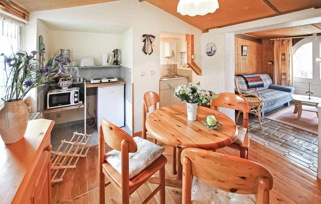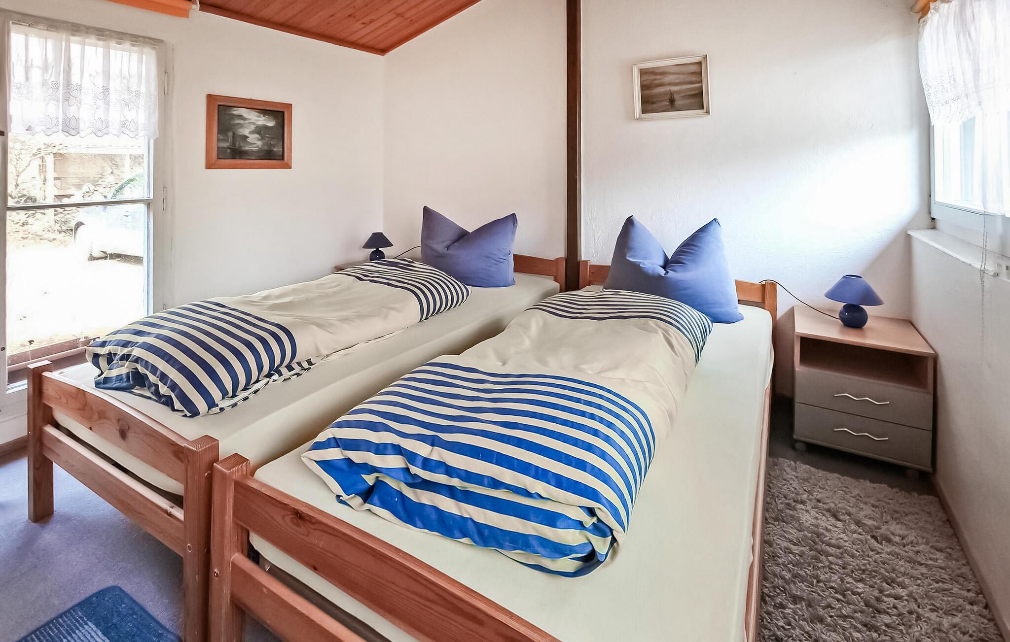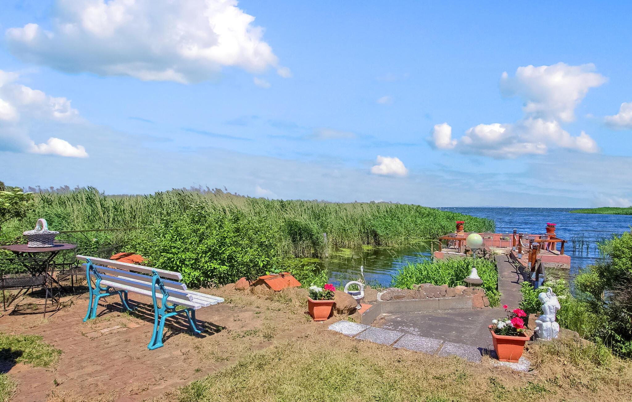 De otte feriehuse ligger på en 2500 kvadratmeter stor natur-/vandejendom direkte ved Szczecin-lagunen. Hvert sommerhus er individuelt og separat. En sti fører fra ejendommen direkte til stranden (ca. 50 m). Alle feriehuse har en møbleret terrasse eller et udendørs opholdsområde med grill og en parkeringsplads direkte ved bungalowen. Ferieboligen er udstyret med: stue (polstrede møbler inkl. sovesofa, TV), soveværelse (2 senge), tekøkken (elkomfur, køleskab, diverse køkkenmaskiner), bad/WC, el-varme. En robåd, en tømmerflåde og en overdækket terrasse lige ved vandet med grill, rygeområde og bålplads står til fri afbenyttelse. Guidede motorbådsture er mulige efter aftale. Den samlede pris inkluderer: slutrengøring, sengelinned, håndklæder, vand og energiforbrug. Betales på stedet: turistskat. En lille hund på op til 40 cm er tilladt i denne ejendom i månederne juli-august. Uden for denne tid er større hunde også tilladt. Bellin, et distrikt i havnebyen Ueckermünde, er et lille feriested i et skovområde direkte ved Szczecin-lagunen. Butikker, restauranter og to strande er i byen. Der er cirka 5 km til Ueckermünde med dens zoologiske have og havn. Herfra er udflugter med passagerskib til Polen og øen Usedom mulige.