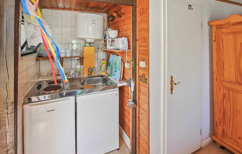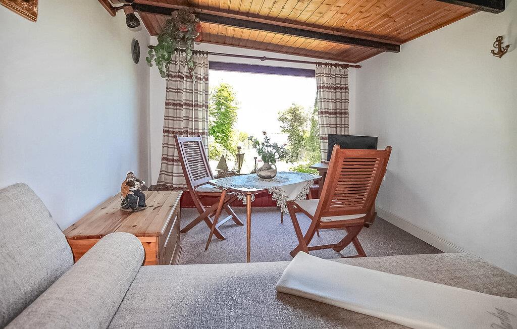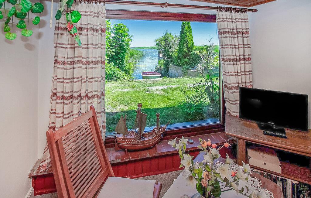 De otte feriehuse ligger på en 2500 kvadratmeter stor natur-/vandejendom direkte ved Szczecin-lagunen. Hvert sommerhus er individuelt og separat. En sti fører fra ejendommen direkte til stranden (ca. 50 m). Alle feriehuse har en møbleret terrasse eller et udendørs opholdsområde med grill og en parkeringsplads direkte ved bungalowen. Ferieboligen ligger direkte ved vandet (ca. 20 m, udsigt over søen). Den er udstyret med: kombineret stue/soveværelse (2 senge, opholdsområde, TV), tekøkken (elkomfur, køleskab, diverse køkkenmaskiner), bad/WC, olieradiator. En robåd, en tømmerflåde og en overdækket terrasse lige ved vandet med grill, rygeområde og bålplads står til fri afbenyttelse. Guidede motorbådsture er mulige efter aftale. Den samlede pris inkluderer: slutrengøring, sengelinned, håndklæder, vand og energiforbrug. Betales på stedet: turistskat. En lille hund på op til 40 cm er tilladt i denne ejendom i månederne juli-august. Bellin, et distrikt i havnebyen Ueckermünde, er et lille feriested i et skovområde direkte ved Szczecin-lagunen. Butikker, restauranter og to strande er i byen. Der er cirka 5 km til Ueckermünde med dens zoologiske have og havn. Herfra er udflugter med passagerskib til Polen og øen Usedom mulige.