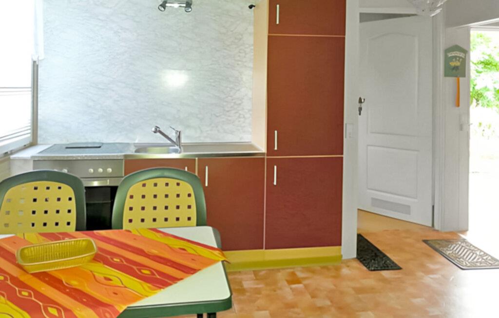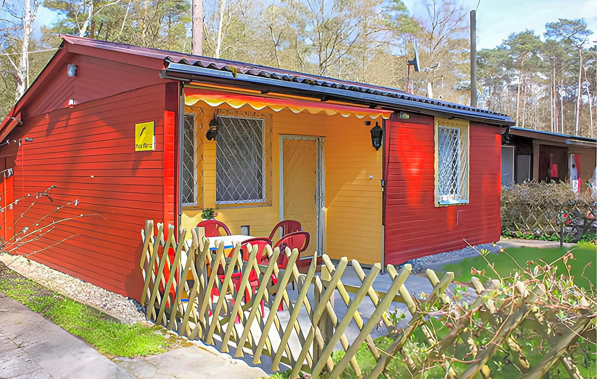 Denne enkle bungalow ligger på en separat, indhegnet grund i en stor ferielandsby lige ud til skov og kun 150 m fra stranden. Den har en opholdsstue (polstrede møbler inklusive sovesofa, TV, radio), et soveværelse (dobbeltseng), et tekøkken med tekøkken inklusive mikrobølgeovn og spiseplads, bruser/toilet og elektrisk varme. Der er møbleret terrasse, liggestol og parkeringsplads til rådighed. Der er en legeplads på stranden. Den samlede pris inkluderer: slutrengøring, vand og energiforbrug. Sengelinned og håndklæder kan medbringes eller lejes.