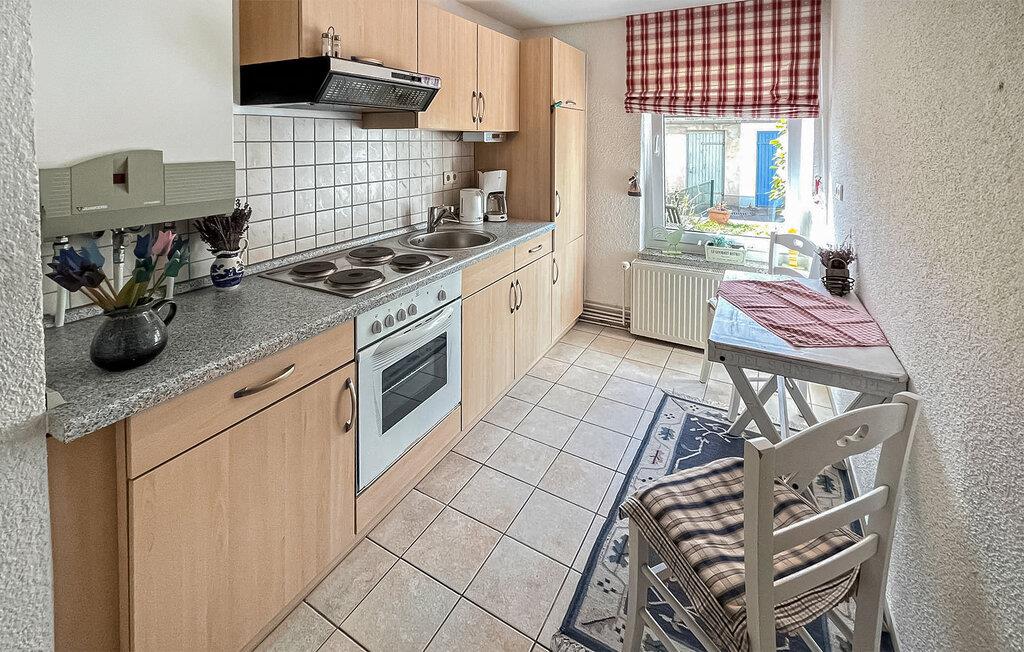 Den lille 1-værelses lejlighed til 2 personer ligger i stueetagen i et rækkehus direkte ved Ueckermünde havn. Den er udstyret med en kombineret stue/soveværelse (dobbeltseng, opholdsområde, fladskærms-tv, radio, gæsteseng, der kan tilføjes), køkken (spiseplads, el-komfur med ovn, køleskab, diverse køkkenmaskiner), et lille badeværelse med brus/toilet og centralvarme. Der er et opholdsområde i gården, en grill og en gratis (offentlig) parkeringsplads ved ejendommen. Den samlede pris inkluderer slutrengøring, sengetøj samt vand- og energiforbrug. Håndklæder skal medbringes. Der er et aflåseligt cykelrum i den tilstødende bygning. Ueckermünde, den østligste tyske havneby ved Stettiner-lagunen, har omkring 12.000 indbyggere. I de senere år har det udviklet sig til en stærkt anbefalet ferieadresse. Der er blandt andet en gammel by, der er værd at se med cafeer, restauranter og indkøbsmuligheder, en lystbådehavn på Uecker med bådudlejning og passagerbådsture til Polen og øen Usedom, en smuk zoologisk have og en velholdt strand med en spa-park og promenade ved Szczecin-lagunen med restauranter, udlejning af strandstole og minigolf. Takket være det veludviklede netværk af cykel- og vandrestier kan de smukke, skovklædte omgivelser nemt udforskes selv uden bil. Lystfiskere vil finde de bedste forhold, især ved Uecker-floden.
