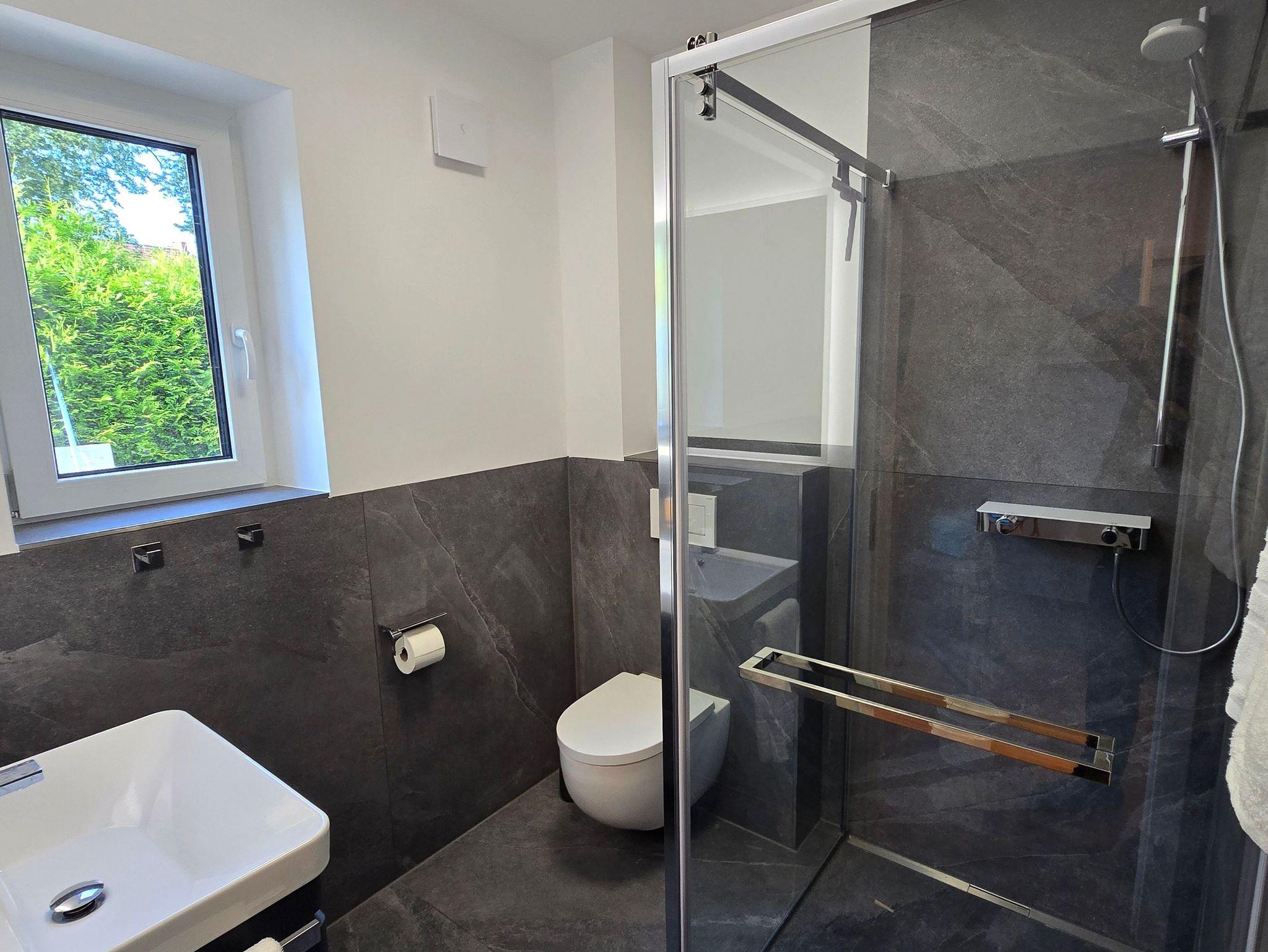 Badezimmer - Wellness für jeden Tag: ebenerdige Dusche mit großformatigen Fliesen und Massageduschkopf, Multifunktionsspiegel mit Bluetooth-Lautsprecher, Spiegelheizung & Beleuchtung, moderne Fußbodenheizung, automatische Abluftanlage, stilvoller Handtuchhalter & Seifenspender