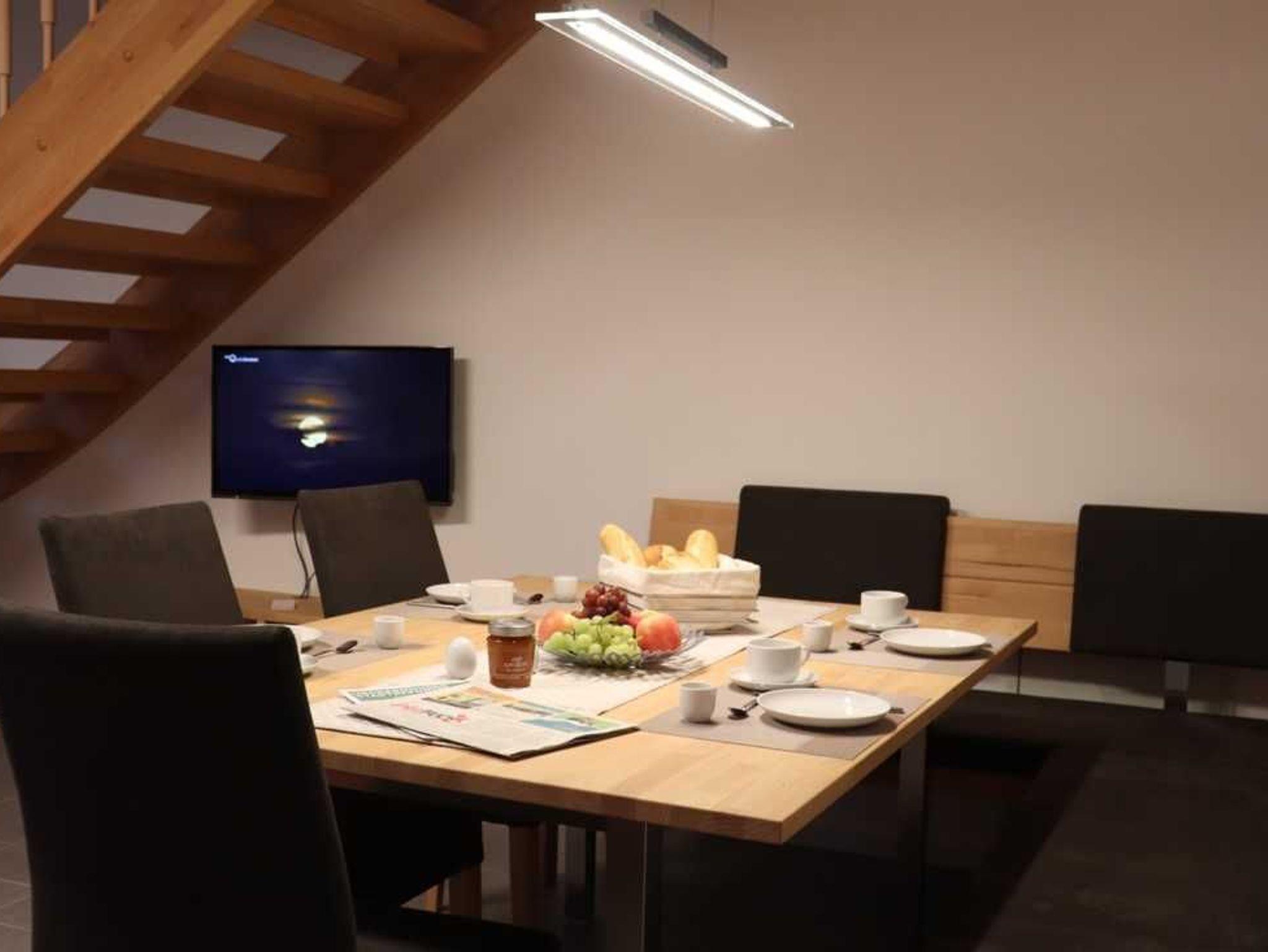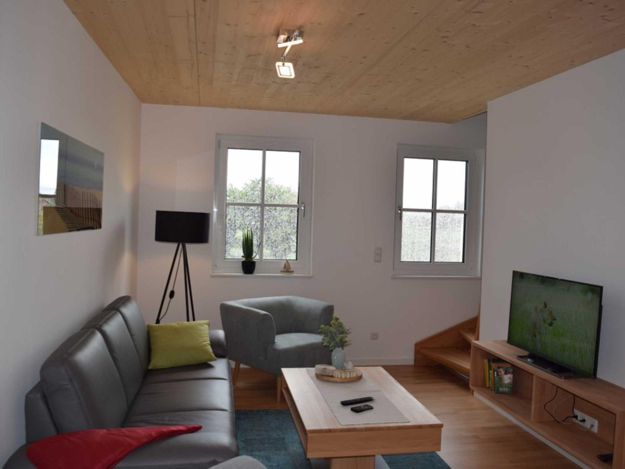 Für die Gäste, die sich etwas zurückziehen möchten, ist im 1. OG ein gemütliches Wohnzimmer, welches zum Lesen, Chatten oder auch Fernsehen einlädt, Sie durch die offene Treppe jedoch an der Gemeinsamkeit teilhaben lässt. Weiterhin befinden sich auch das Schlafzimmer mit zwei Einzelbetten sowie das Badezimmer mit Dusche und Badewanne hier.
