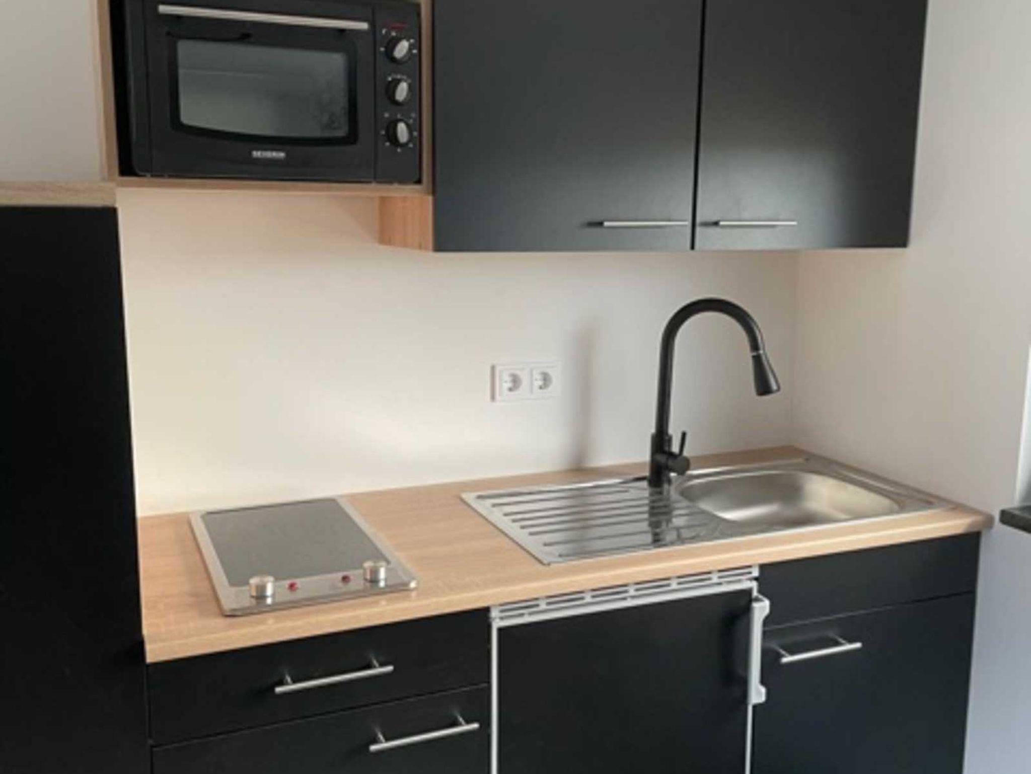 Im Küchenblock finden Sie einen Kühlschrank, ein Minibackofen , ein Kochfeld, Spüle, Kaffeemaschine, Wasserkocher und entsprechendes Kochgeschirr vor.