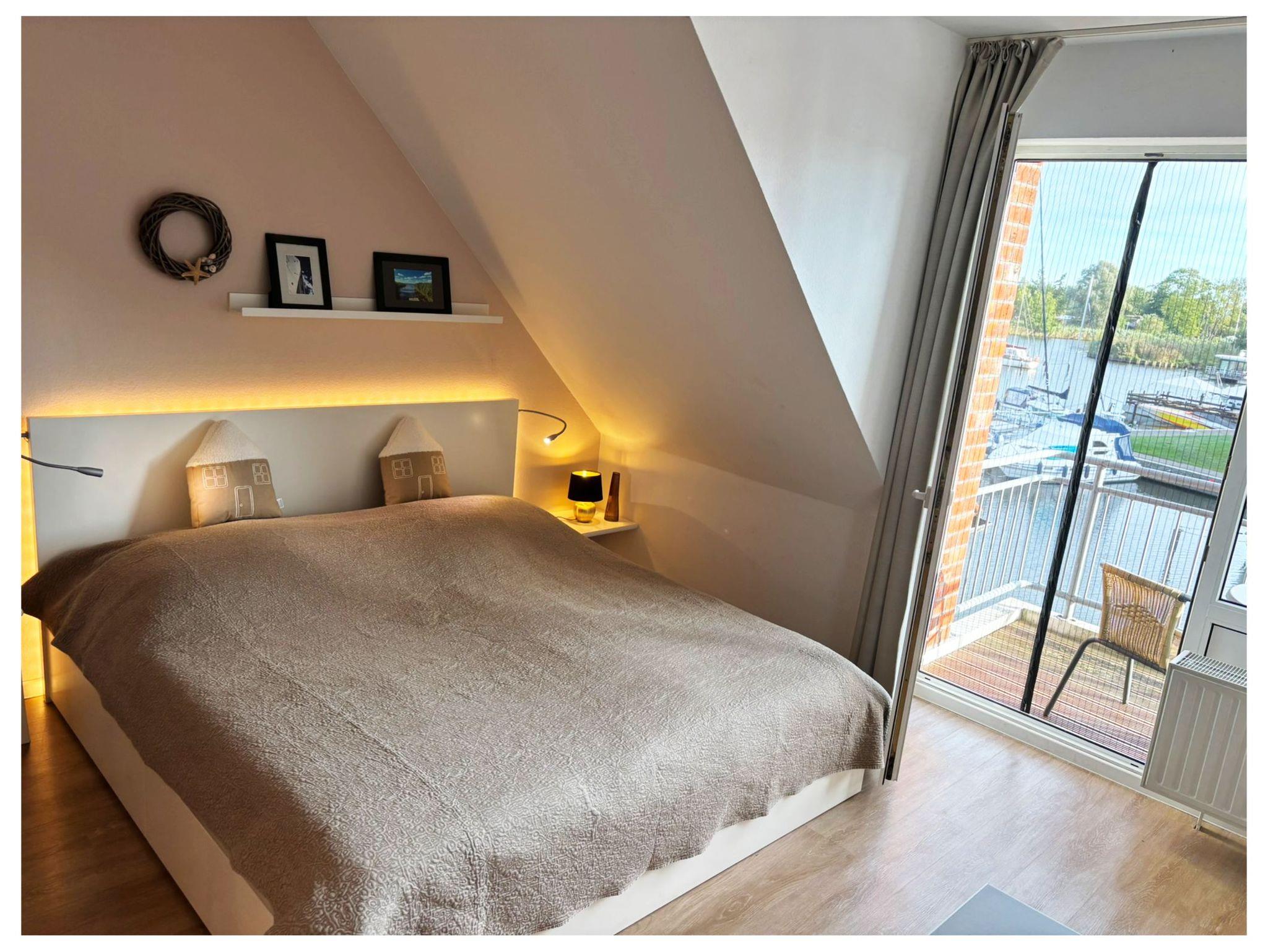Genießen Sie vom Balkon aus einen einzigartigen Blick über den Hafen und die Hafeneinfahrt, die Uecker und in der Ferne das Stettiner Haff und die weite Küstenlandschaft - mit maritimer Stimmung von früh bis spät, perfekt für den ersten Kaffee am Morgen oder ein Glas Wein bei Sonnenuntergang. Das Apartment verfügt über einen Balkon, ein Wohn- und Schlafzimmer mit Küchenzeile und ein Bad mit Dusche und WC. Belegung 2+1 (bis 6 Jahre im Bett der Eltern). Die Küche ist mit zwei Kochfeldern und einer Mikrowelle ausgestattet. Das Apartment verfügt über Kabel-TV, Radio, Fön, Fliegengitter u.v.m. Ein Pkw-Stellplatz ist für Sie kostenfrei. Direkt im Yachthafen: Fahrrad-, Boots- und E-Scooter-Verleih, wunderschön gelegene Grillplätze, Volleyballfeld, Basketballkorb und ein kleines Rasenfußballfeld, Außenschachspielfläche, Frühstücksrestaurant im Hafengebäude eine Minute entfernt, Brötchenverkauf eine Minute entfernt, Angelmöglichkeit in der Uecker, separierter Spielplatz, Fahrradunterstellmöglichkeit