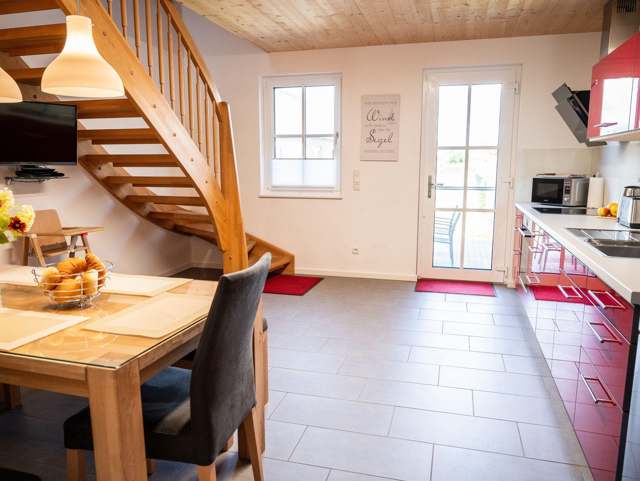 Im 1. OG befinden sich der Wohnraum (Polstermöbel, Flachbild-TV), 1 Schlafraum (2 Einzelbetten) und das Bad mit Dusche und Wanne. Im 2. OG gibt es 2 weitere Schlafräume mit je einem Doppelbett. Diese Schlafräume stehen erst ab einer Belegung von mindestens 3 Personen zur Verfügung.Für Kleinkinder stehen ein Kinderbett und ein Kinderhochstuhl kostenfrei bereit (bitte den Bedarf vor Anreise beim Eigentümer anzeigen). Internet (WLAN) und Magenta-TV sind ebenfalls vorhanden.