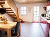 Der Innenausbau einschließlich der Möbel besteht aus geöltem Buchenholz. Die Ausstattung ist insgesamt sehr hochwertig und genügt gehobenen Ansprüchen. Das Haus erstreckt sich über drei Wohnebenen. Im Erdgeschoss befinden sich eine große Küche mit kompletter Küchenzeile (E-Herd mit Backofen, Kühlschrank mit Tiefkühlteil, Geschirrspüler, Mikrowelle, div. Küchengeräte, Esstisch, Flachbild-TV), ein Gäste-WC und ein Hauswirtschaftsraum mit Waschmaschine und Trockner.