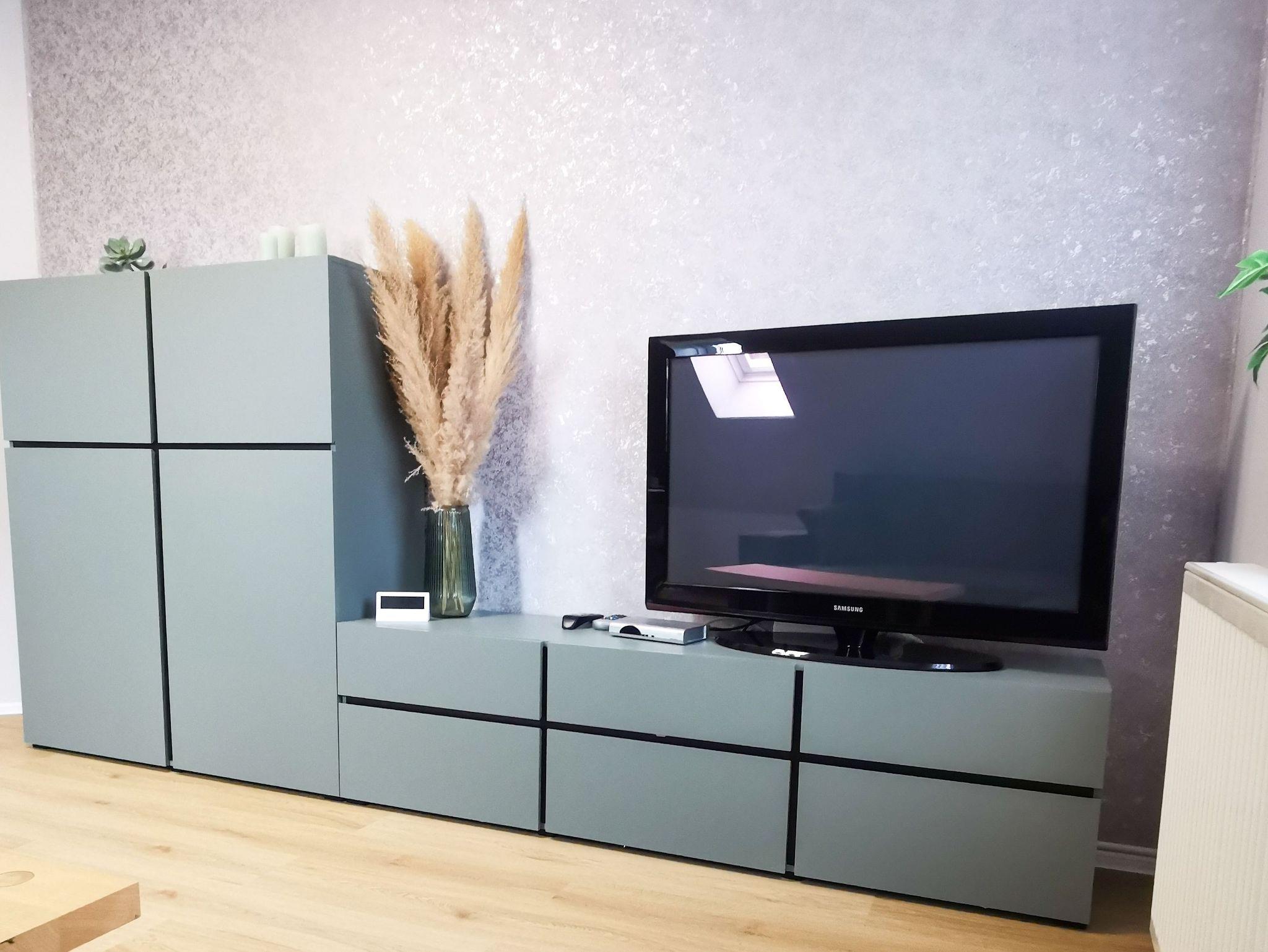 Wohnbereich: In unserem grünfarbenen Wohnbereich befindet sich eine gemütliche Eckchouch aus Cord mit Schlaffunktion und passenden Möbeln dazu.