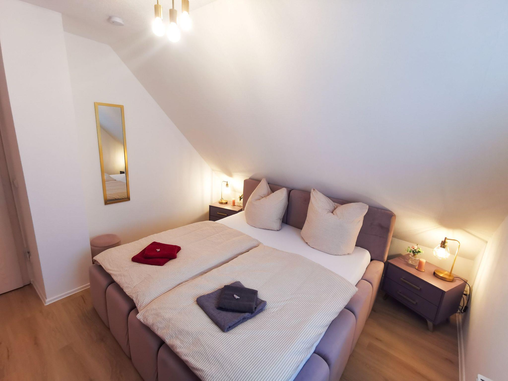 Unsere moderne und neu ausgestattete Wohnung bietet im 1. Obergeschoss auf 60 qm für bis zu sechs Personen Platz an, also ideal für Ihren Familienurlaub. Schlafbereich 1: Das Schlafzimmer ist mit einem großen Polsterbett von 180 x 200 cm aus fliederfarbenen Samt mit passenden Möbel und Deko in flieder/gold liebevoll ausgestattet. Schlafbereich 2: Unser zweiter Schlafbereich in gelb/orange gehalen hat zwei Betten von jeweils 90 x 200 cm, die man wahlweise zusammen als Ehebett oder einzeln nutzen kann sowie reichlich Stauraum in der Kommode. Wohnbereich: In unserem grünfarbenen Wohnbereich befindet sich eine gemütliche Eckchouch aus Cord mit Schlaffunktion und passenden Möbeln dazu. Essecke: Die Essecke lädt zum Frühstück am Morgen, mittags oder Dinner am Abend für bis zu 6 Personen ein. Bad: Das Bad ist mit einer Badewanne und einem Duschvorhang ausgestattet, das ebenso mit Liebe eingerichtet wurde. Küche: Unsere Küche ist klein, aber fein (Herd, Wasserkocher, Toaster, Kühlschrank mit Minibar).