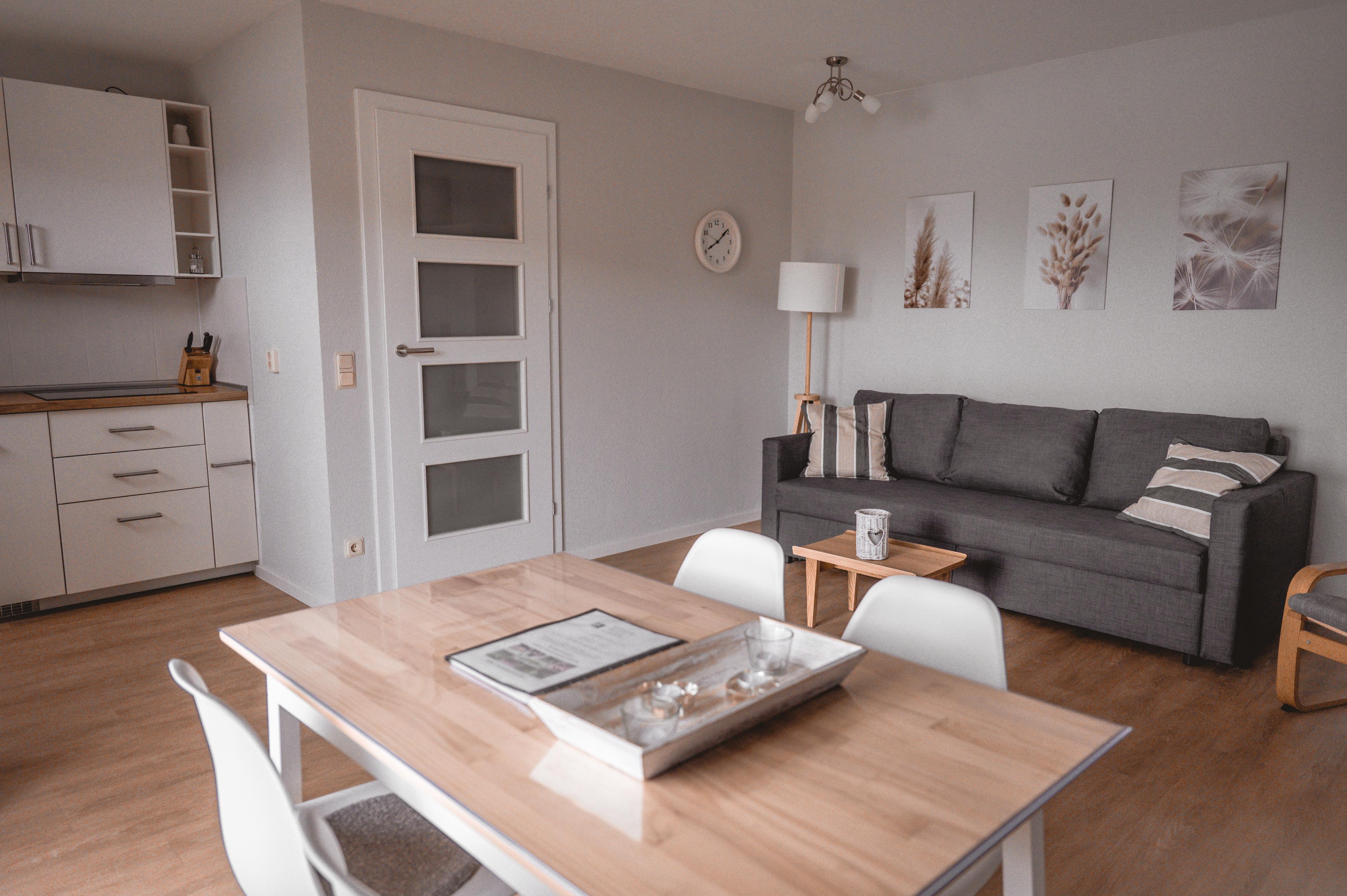 Das lichtdurchflutete Wohnzimmer verfügt über einen Esstisch mit vier Stühlen, ein ausziehbares Schlafsofa mit einem Schlafplatz für zwei Personen und einen Sessel. Ihren Übernachtungsgästen des Wohnzimmers steht hier auch ein Kleiderschrank bereit. Multimedial steht Ihnen hier ein großer Flachbildfernseher zur Verfügung. Ihre Ferienwohnung hat einen Kabelanschluss. Auch einige Gesellschaftsspiele dürfen hier im Bestand nicht fehlen. In Ihrem Schlafzimmer befindet sich ein Doppelbett mit höhenverstellbaren Lattenrosten. Nachtische und Leselampen möchten hier von Ihnen genutzt werden. Der große Schrank und das Kofferboard werden Ihnen gute Dienste leisten und genügend Stauraum für Ihr Gepäck bieten. Die Küche ist zum Wohnzimmer hin offen, was den Raum noch großzügiger erscheinen lässt. Ihre Küchenzeile ist voll ausgestattet. Bestandteile sind unter anderem ein Cerankochfeld, eine Kaffeemaschine, viel Geschirr, ein Geschirrspüler, eine Mikrowelle, ein Backofen sowie eine Kühl- und Gefrierkombination. Kulinarisch sind hier also keine Grenzen gesetzt. Ihr großes Badezimmer ist mit einer extrahohen Duschkabine und ausreichend Ablageflächen ausgestattet. Ihr Flur beherbergt eine Garderobe und einen großen Spiegel für Sie. Das Appartement Juno liegt im Erdgeschoß des Hauses Wikinger, im Eingang 3. In unmittelbarer Nähe dieses Appartements befinden sich weitere Ferienappartements unserer Gesellschaft. Eine gemeinsame Anmietung ist hier sehr gut möglich.