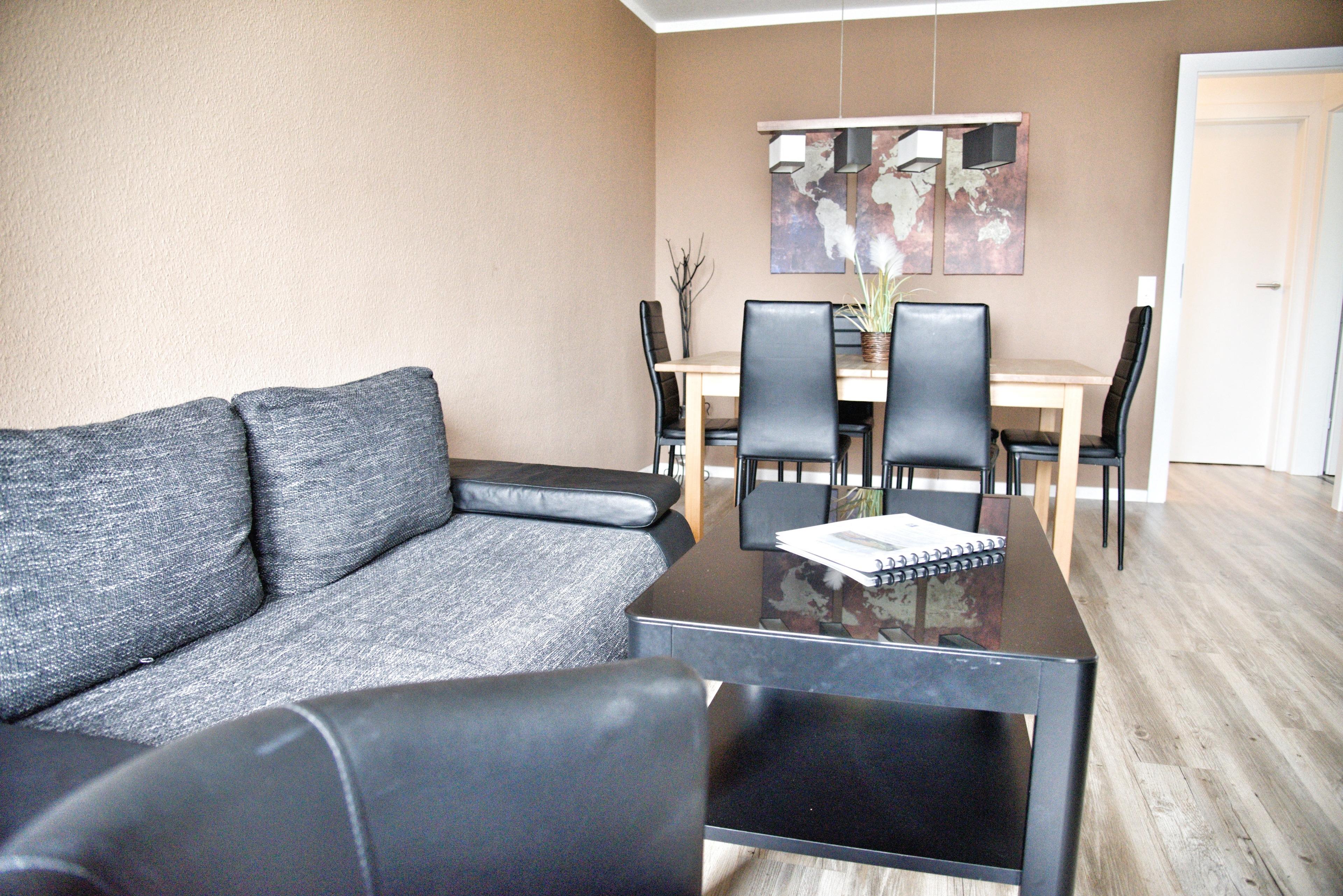 Ihr Wohnzimmer verfügt über einen Esstisch mit sechs Stühlen, ein ausziehbares Klappsofa mit einem Schlafplatz für zwei Personen und einen Sessel. Multimedial stehen Ihnen ein großer Flachbildfernseher zur Verfügung. Die Ferienwohnung hat auch einen Kabelanschluss.